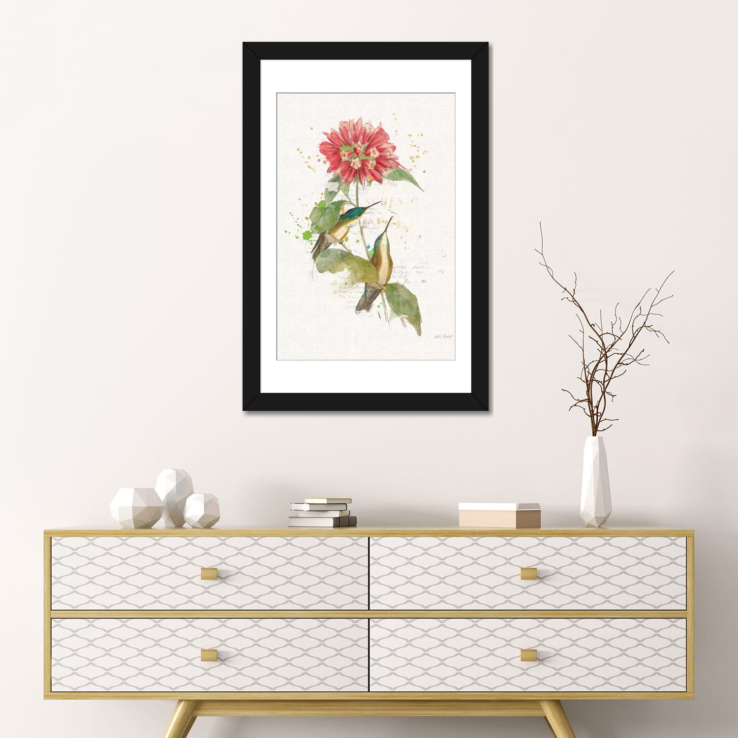 Antique inspiration and natural style meet in this lovely graphic art print, showcasing a pair of hummingbirds perched atop a blooming flower. Subtle textual overlay gives this print a bit of classic …. Read More.