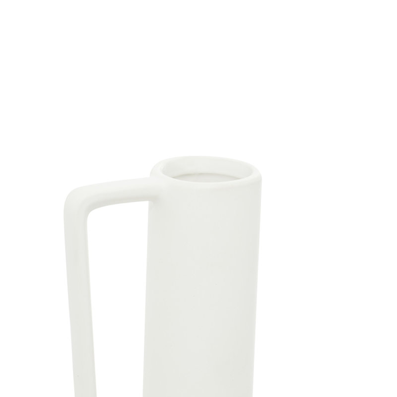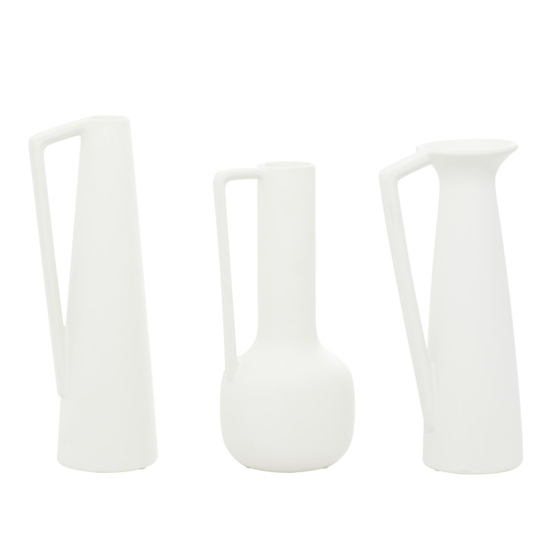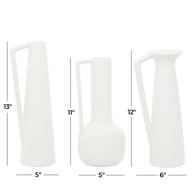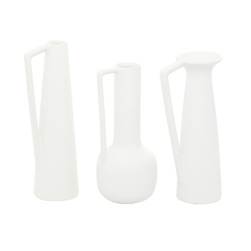 - Stoneware set of 3 vases features tall vases in varying shapes and sizes with small openings and curved handles