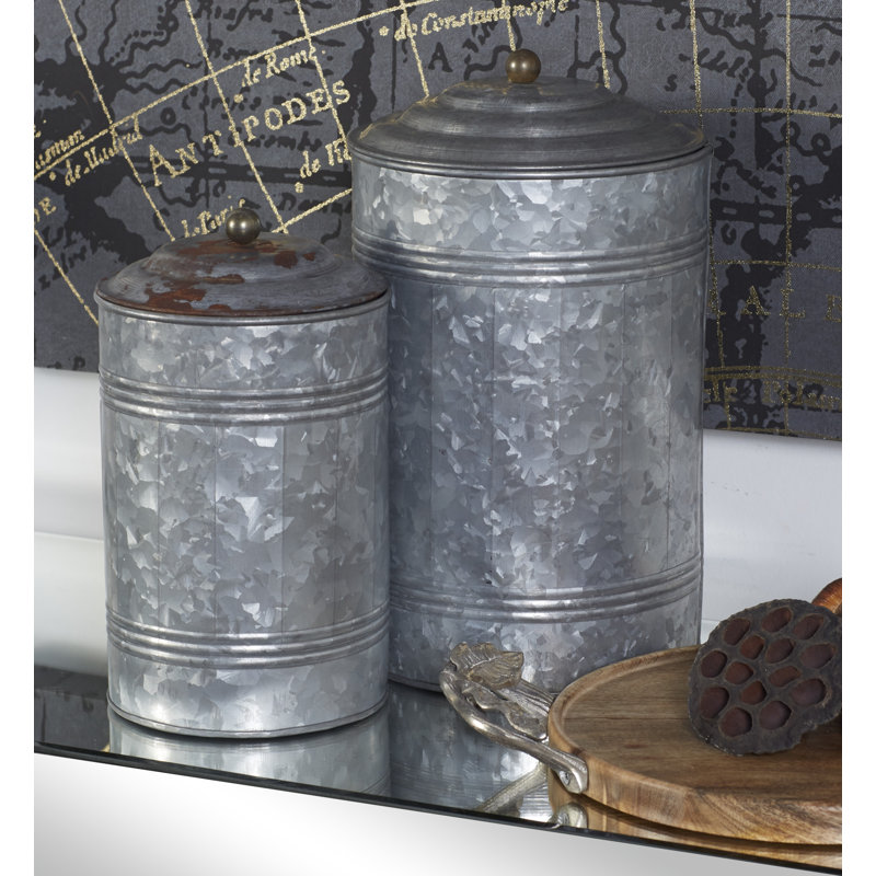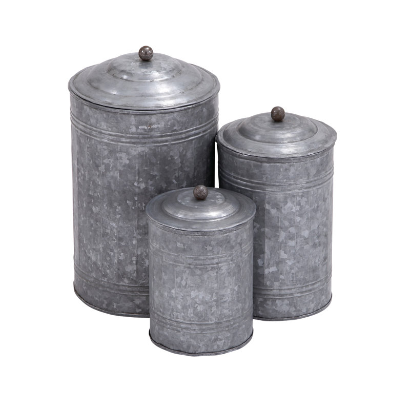 - This farmhouse style inspired design gray galvanized iron canister set features a distressed external design with galvanizing pattern stains furnished with a low round lid with a spherical handle