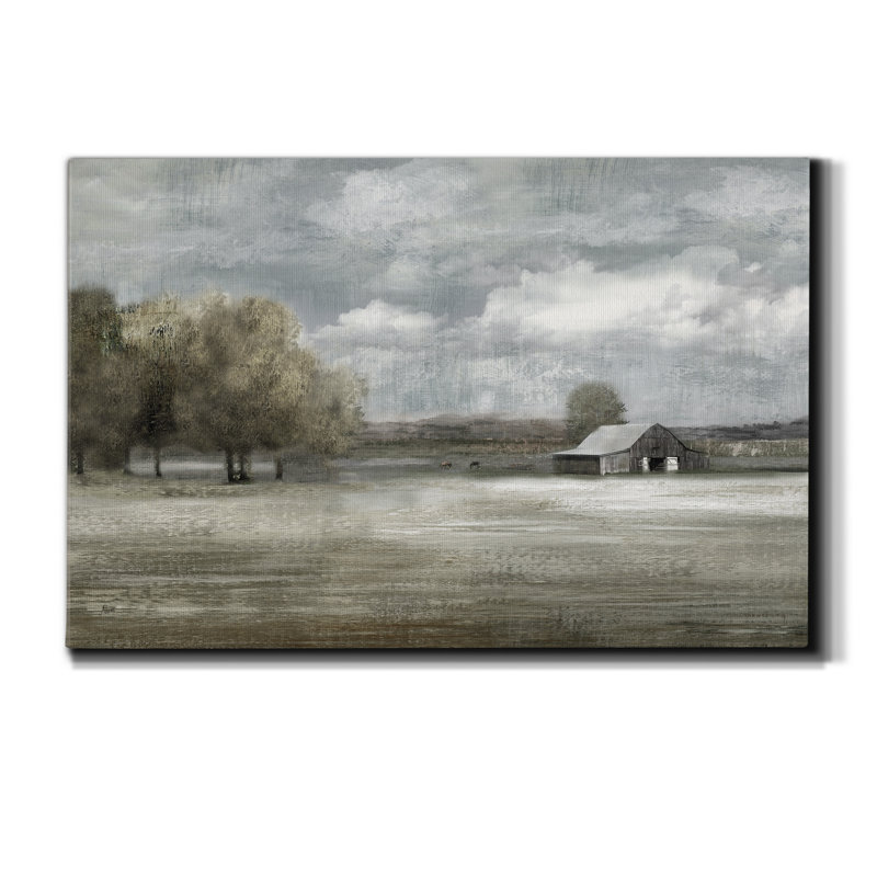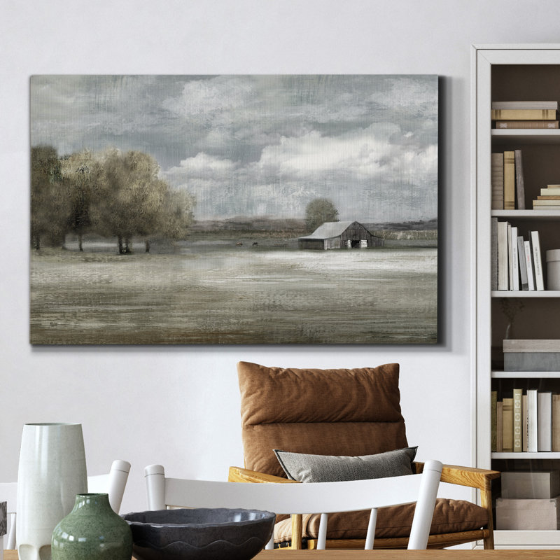 This painting print is a classic country scene that features a ramshackle barn and a couple of horses grazing in the background. There are also a few trees scattered across a field and a fair-weather sky overhead. Subtle green, gray, and blue tones bring a tranquil modern farmhouse vibe to your home. This acrylic painting is printed on a rectangular canvas and wrapped around a wooden frame to create a look that rivals any gallery. Wall-mounting hardware is included for hassle-free hanging right when it arrives.