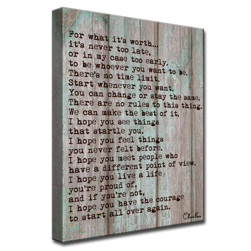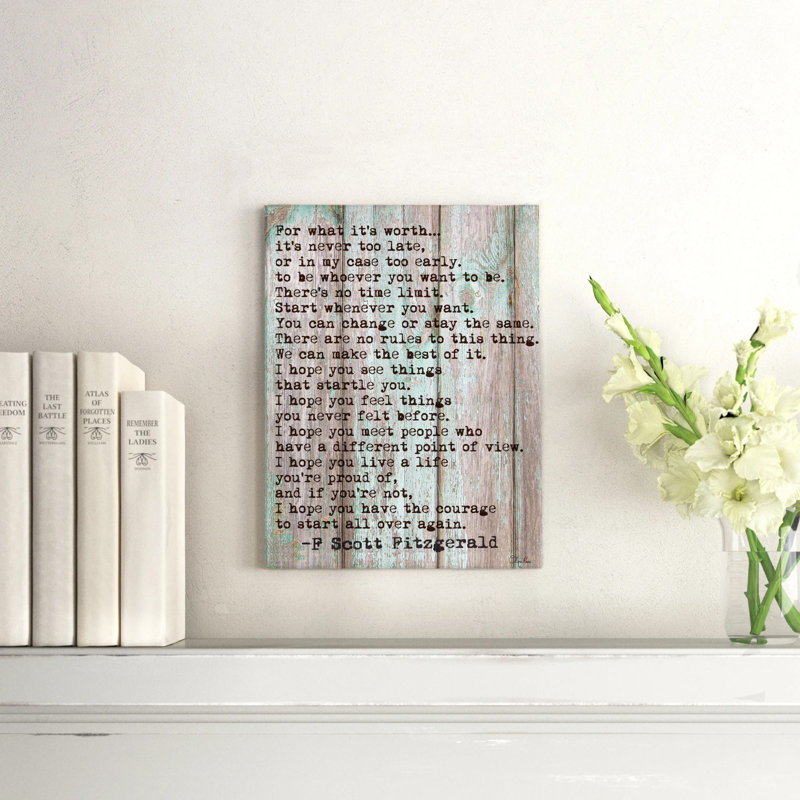This textual art canvas print brings inspirational words and rustic style to any space. This rectangular piece features a quote from author F. Scott Fitzgerald printed in black in a typewritten style against a rustic brown and gray faux wood background. It’s made in the USA, printed on canvas, and stretched over a kiln-dried pine wood frame. This piece comes with wall mounting hardware, so it’s easy to hang vertically in your bedroom, living room, or home office.