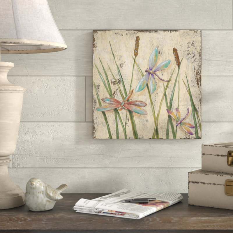 - This ready to hang, gallery-wrapped art piece features three dragonflies over a beige background