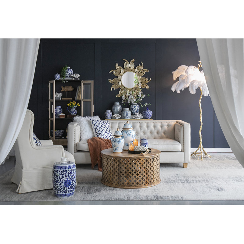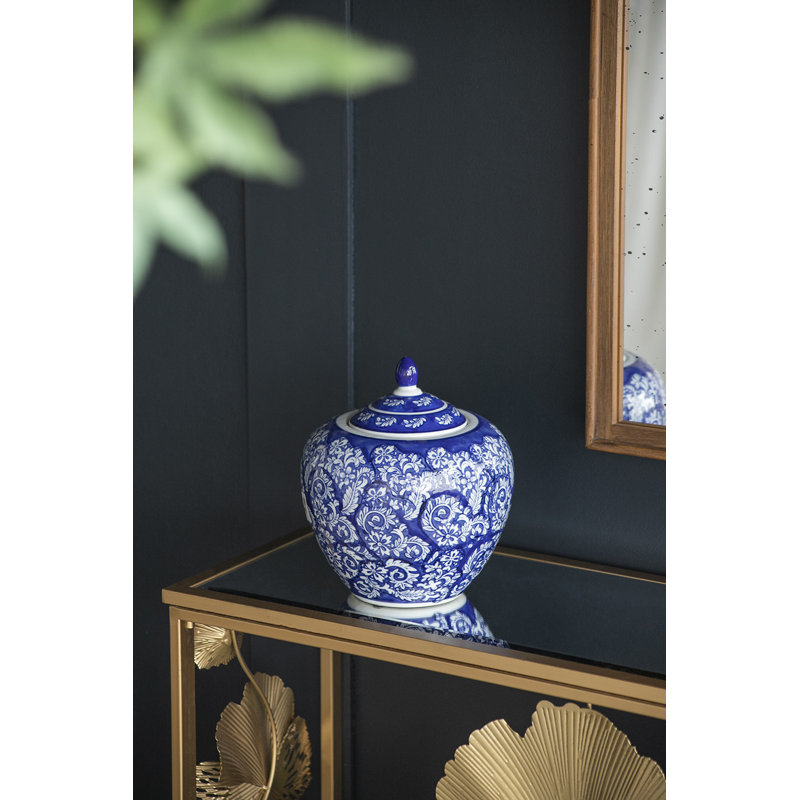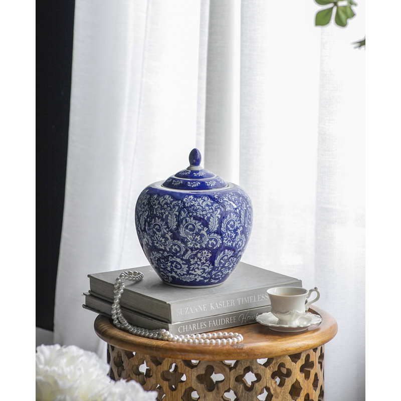 This ceramic urn is a classic, elegant decor option for traditional settings. Its lovely floral pattern in blue and white takes inspiration from Ming-era ceramics and antique pieces, and the subtle distressing gives it a well-loved, vintage feel. Just right for displaying on a mantel or as a centerpiece, it’s designed for decorative purposes only, so it’s best to admire its timeless beauty rather than using it for storage. Just give it an occasional dusting to keep the glaze looking shiny.