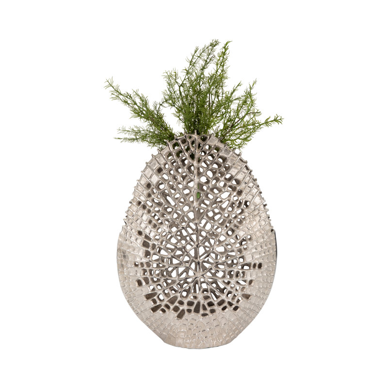 Elevate your interior with this glam-style metal vase, expertly crafted from durable aluminum and designed to impress with its intricate leaf-inspired openwork. The sculptural silhouette delivers a bold decorative impact, blending artisanal craftsmanship with modern elegance for a striking statement in any home, office, living room, or bedroom. Ideal as a standalone accent or as a stylish vessel for dried botanicals, this vase brings luxury and eye-catching texture to your decor. Its sturdy construction ensures long-lasting beauty while the open design adds depth and visual interest. Perfect for those seeking unique home accents with a designer flair. Add this standout piece to your space today and transform your decor with effortless style.