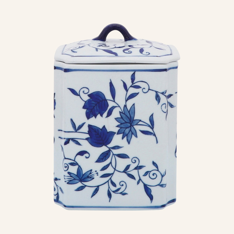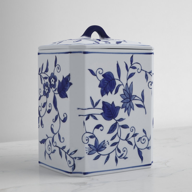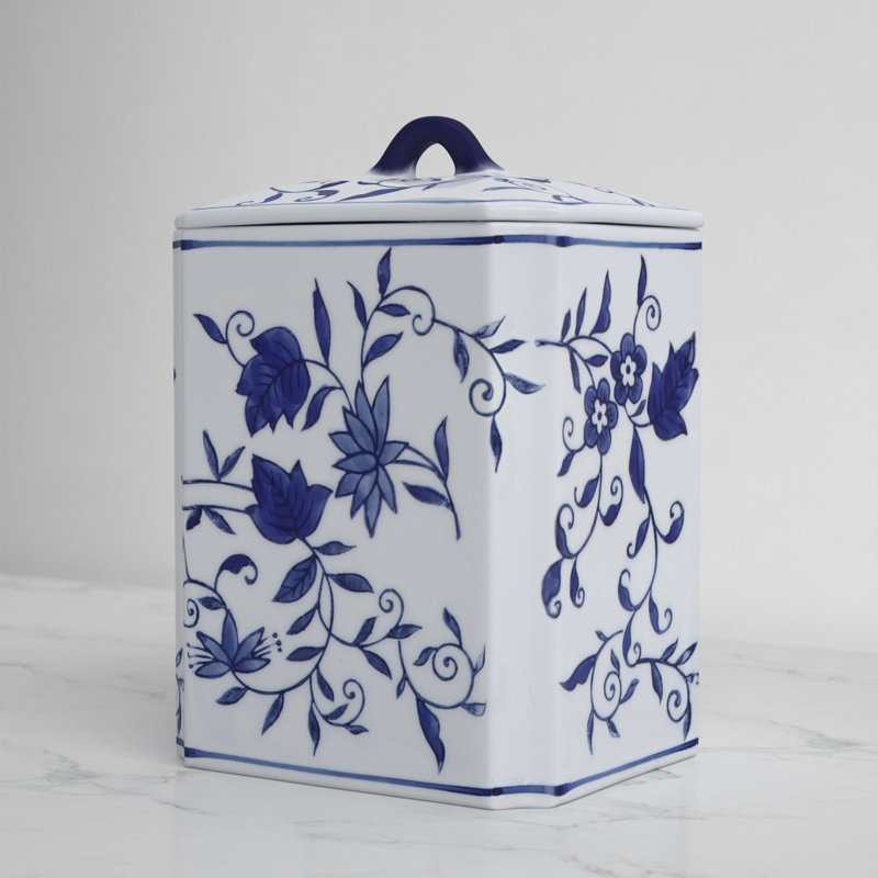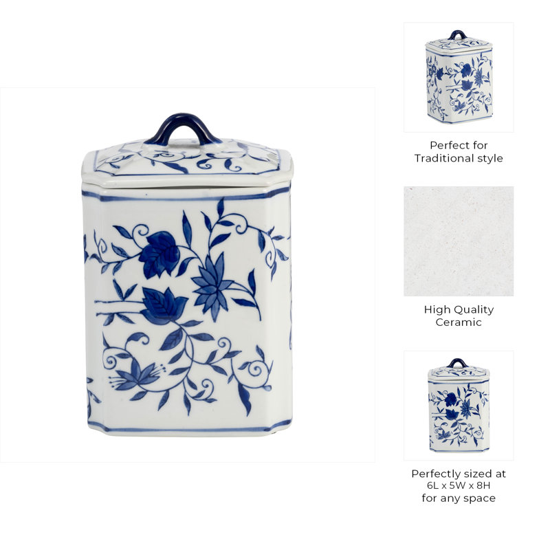 Add timeless beauty and organization to your space with this traditional ceramic storage jar featuring a classic blue and white Chinoiserie design with delicate floral patterns. Expertly crafted from durable stoneware and ceramic, this decorative container measures 6x5x8 inches, making it a perfect fit for your living room shelf, bedroom dresser, or home office desk. Its elegant style enhances any decor while offering practical storage for small items like stationery, keepsakes, or trinkets. The glossy finish and intricate detailing make it a standout blue chinoiserie decor piece that instantly elevates any setting. Whether used alone or grouped with other elegant home accents, this jar combines charm with function. Bring refined organization and timeless artistry into your home today. Order now to add effortless elegance to any room.