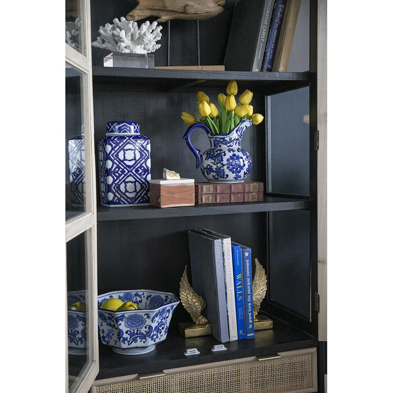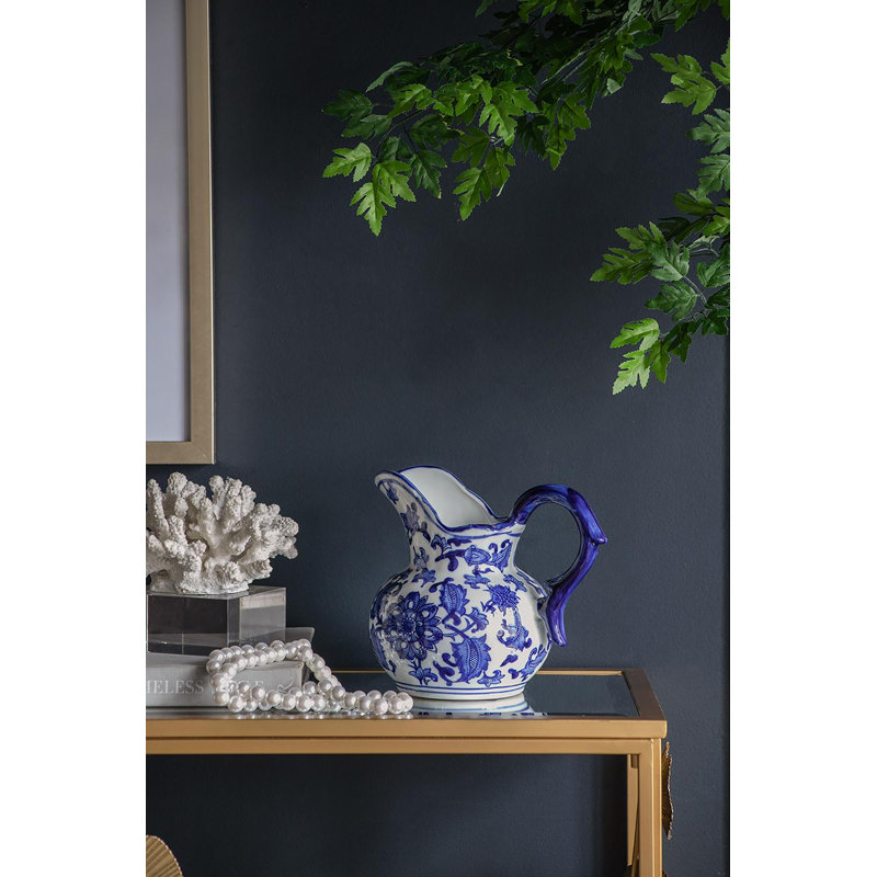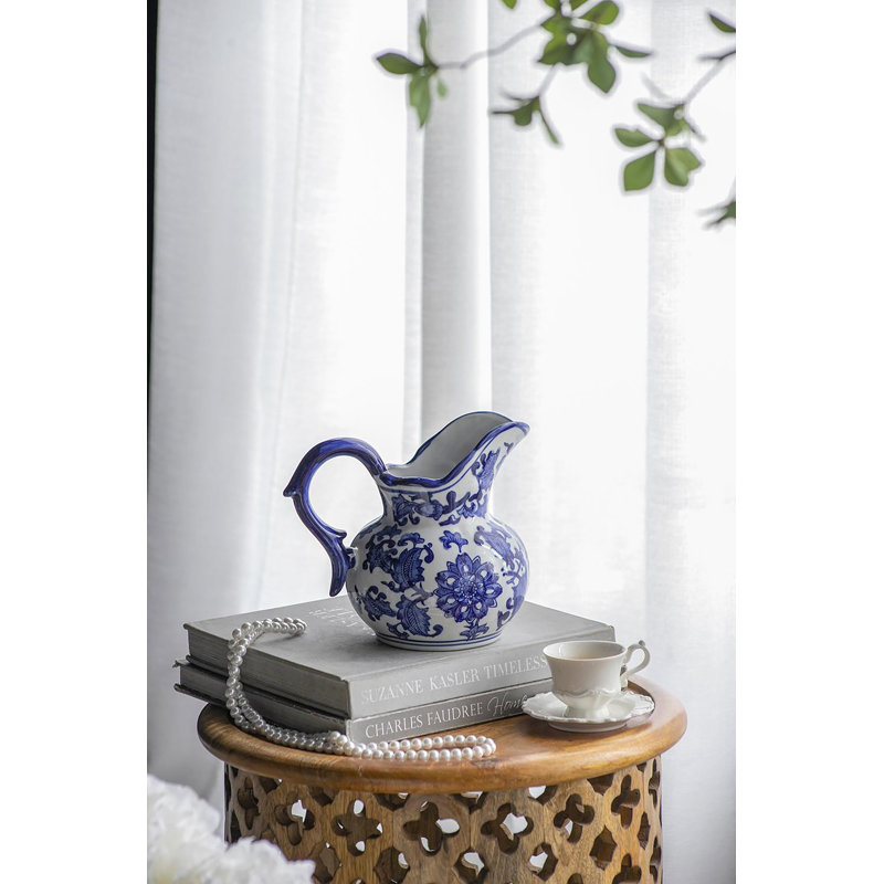 This wide milk jar makes a charming accent, and features a blue and white chinoiserie design. Ideal for homes with traditional decor, it’s a unique accent that looks effortlessly elegant as kitchen decor. A sculpted handle completes this classic design.
