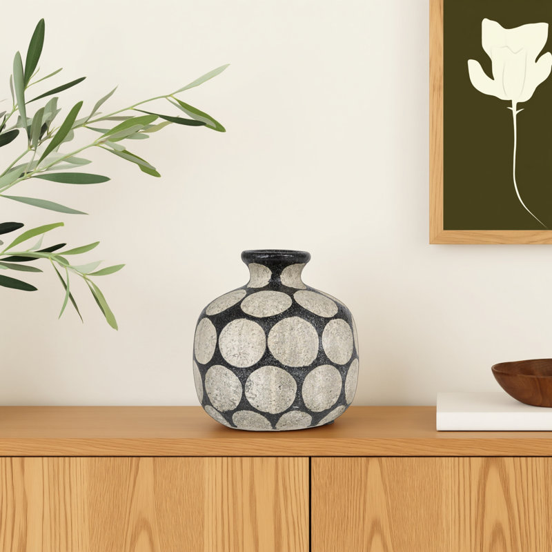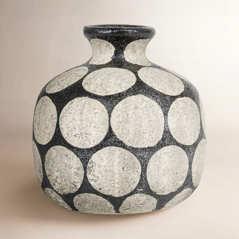 This stylish vase adds sophistication and edge to any home. The terra-cotta vase features a black and cement color scheme that creates a sleek and elegant look. The vase also boasts a wax relief dot p…. Read More.