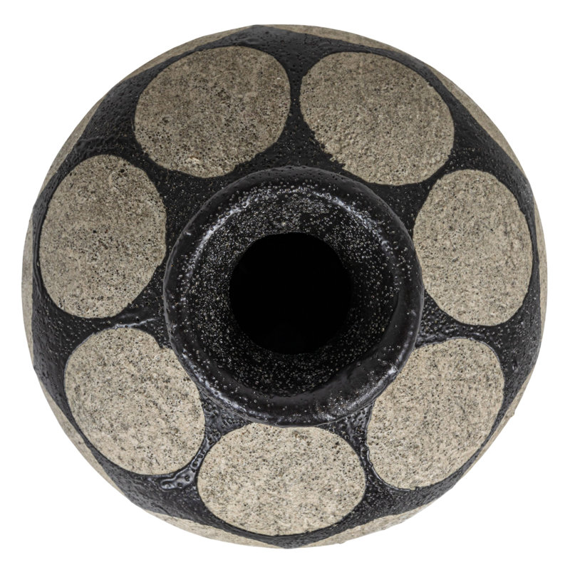 - A stylish vase that features a black and cement color scheme and a wax relief dot pattern