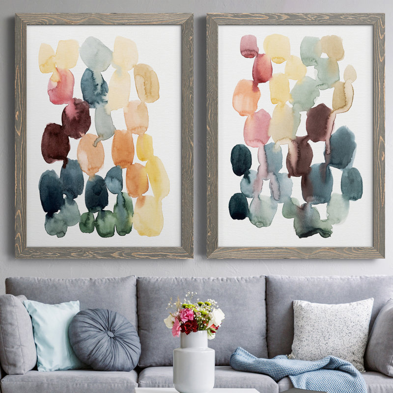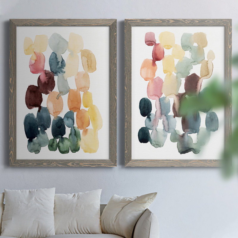 This 2-piece abstract picture frame painting set, Desert Stones I, features a series of watercolor-like color swatches in an array of bright hues. It’s made in the USA and printed on canvas with a ric…. Read More.
