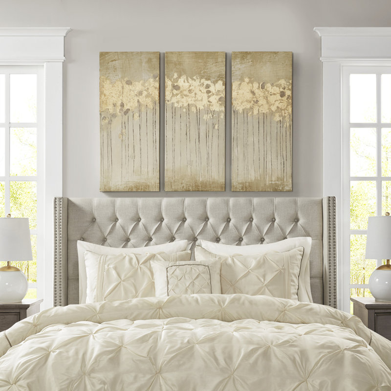 Add a splash of color and style to your decor with the Midnight Forest Hand Painted Gel-Coated Gold Foil 3-Piece Set by Artist Delsie Walters. Each gel-coated canvas features an abstract tree design, combined with a metallic gold foil for the perfect touch of glam. The gel coat provides added texture and a glossy finish and protects the colors from fading over time, while two D-rings on the reverse of each canvas make this set easy to hang on your walls. It comes as a three-piece set, each measuring 15×35″. Simply hang them all together for a large focus piece or separately throughout your home for a more stylized approach fitting any space. This 3-piece canvas wall art set is perfect for brightening and elevating your home decor. Wipe clean with a damp cloth.