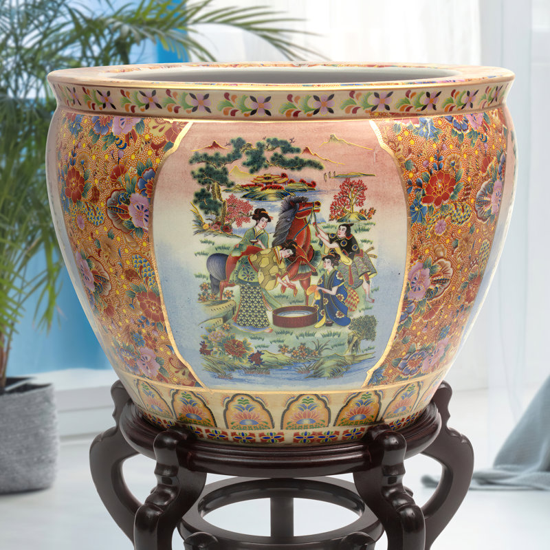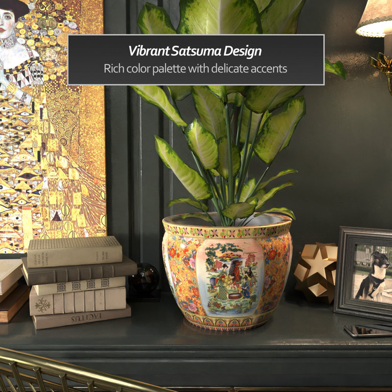 - Satsuma Design: Meticulously hand-painted with an intricate scene showcasing a samurai’s horse and attendees in vibrant and colorful landscapes. The rich color palette and delicate gold accents celebrate the artistry and heritage of the Far East.