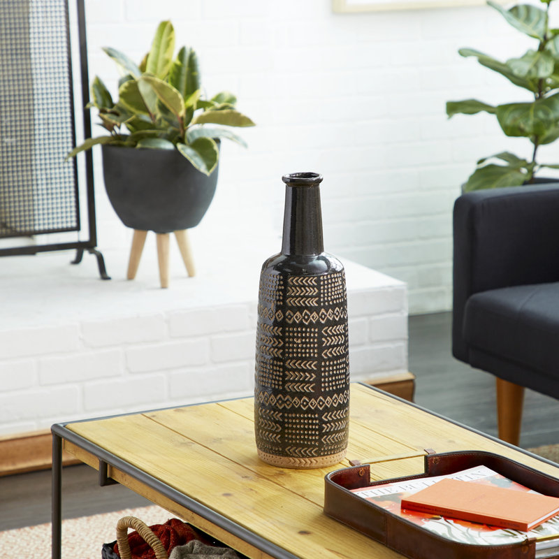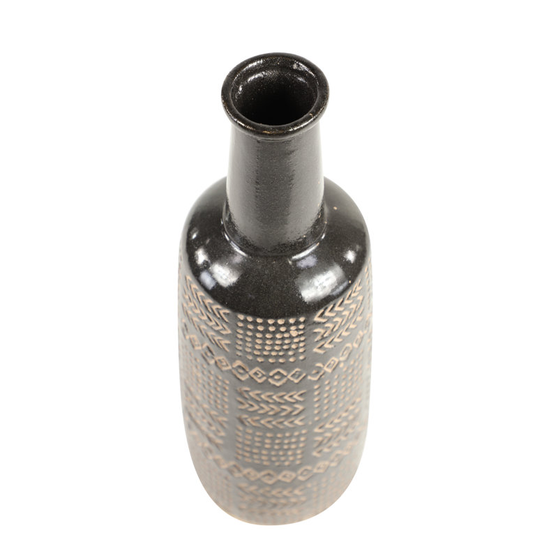 - Porcelain is molded and glazed into a textured tribal pattern vase