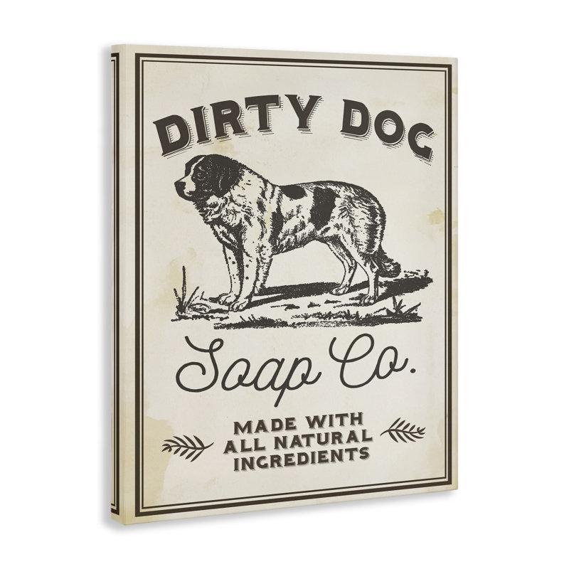 This art print adds a playful look to your bathroom or laundry room decor. Featuring a beige and gray color palette, the “Dirty Dog Soap Co” graphic art print by Daphne Polselli is a fun and eye-catching piece with a black-and-white Saint Bernard in the center. This canvas print is available in a variety of framing options, making it easy to coordinate with your existing style. With its portrait orientation and overall rectangular shape, this single-piece item is ideal for adding a bit of whimsy to your space. Wall-mounting hardware is included, so you can hang it up with ease.