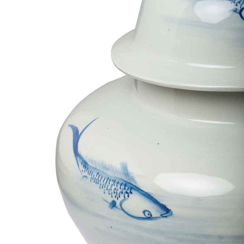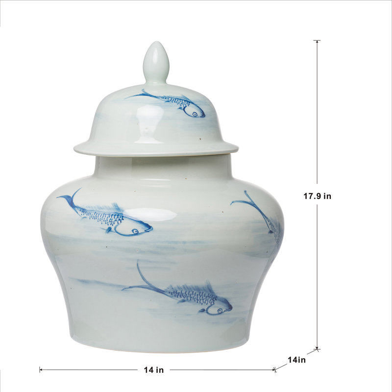 This Dorcus Ginger Decorative Jar is an elegant tabletop accent. Featuring lightly brushed fish, the decorative jar adds a gentle serenity.