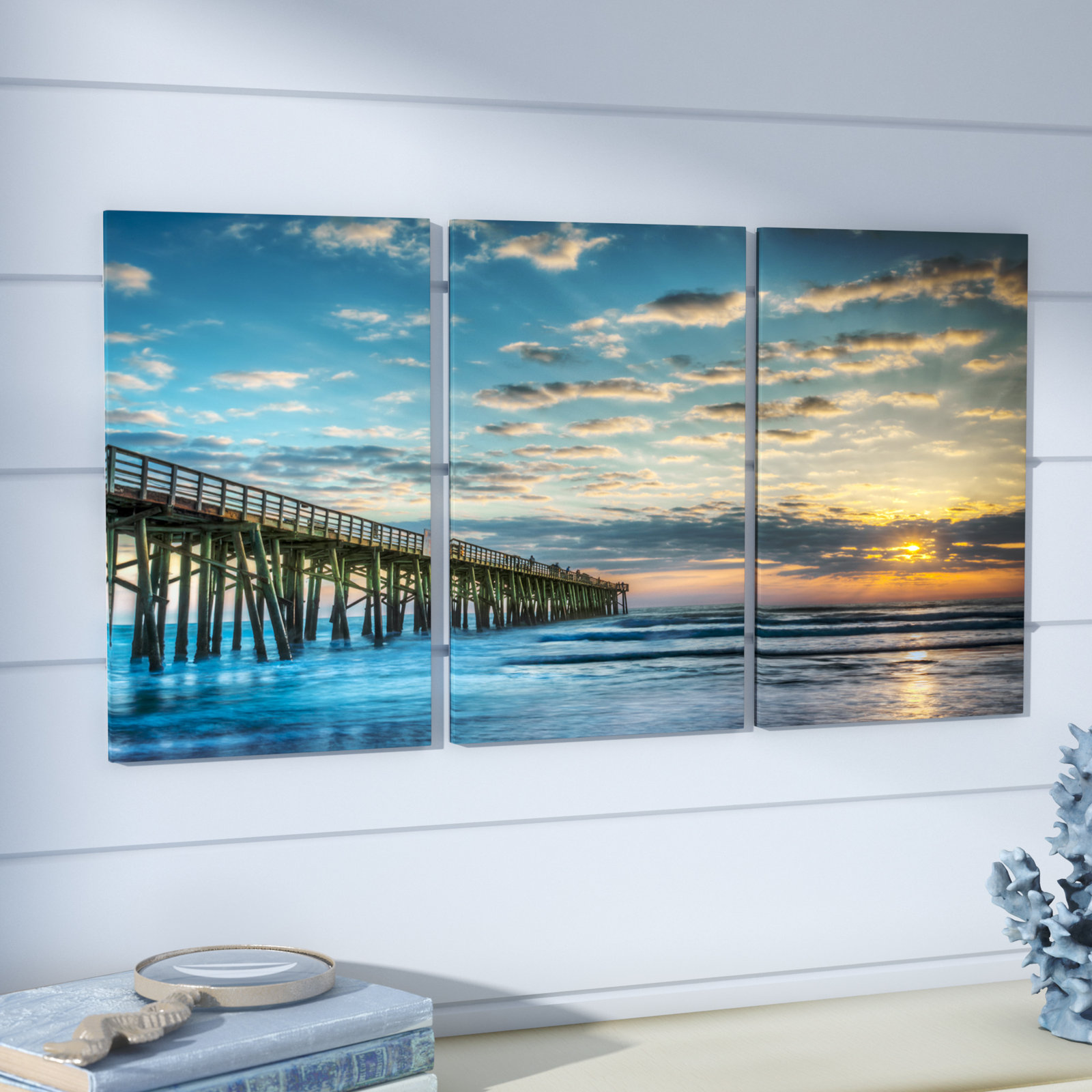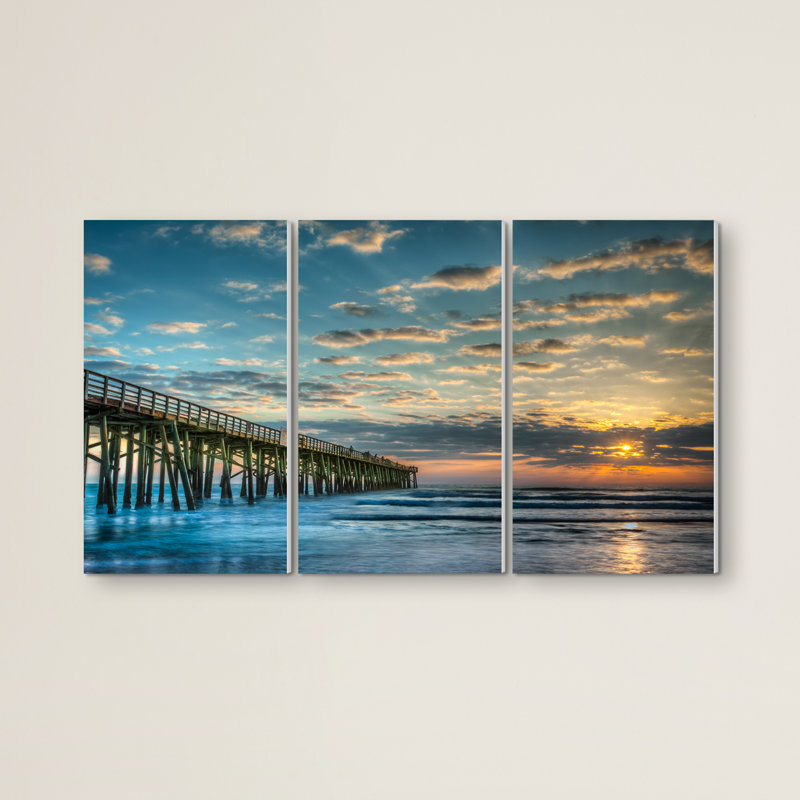Enjoy the view of a peaceful pier from the comfort of your own home with this three-piece graphic art print. Capturing a coastal sunset scene, this artful addition showcases blue and orange hues to offer a splash of color. Measuring 17” H x 33” W x 0.5” D overall, it’s well suited to spruce up wide-open spaces on your walls. Proudly made in the USA, this piece is printed on manufactured wood and includes wall-mounting hardware for easy installation.