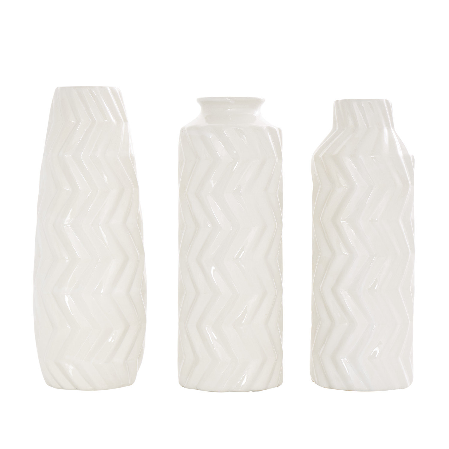 - The set of 3 vases feature a dimensional ribbed chevron pattern over three different shapes, adding a touch of artistic flair and visual interest to any space