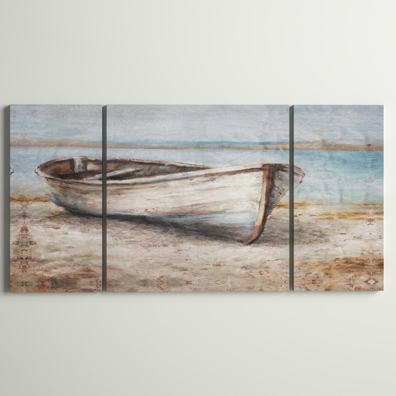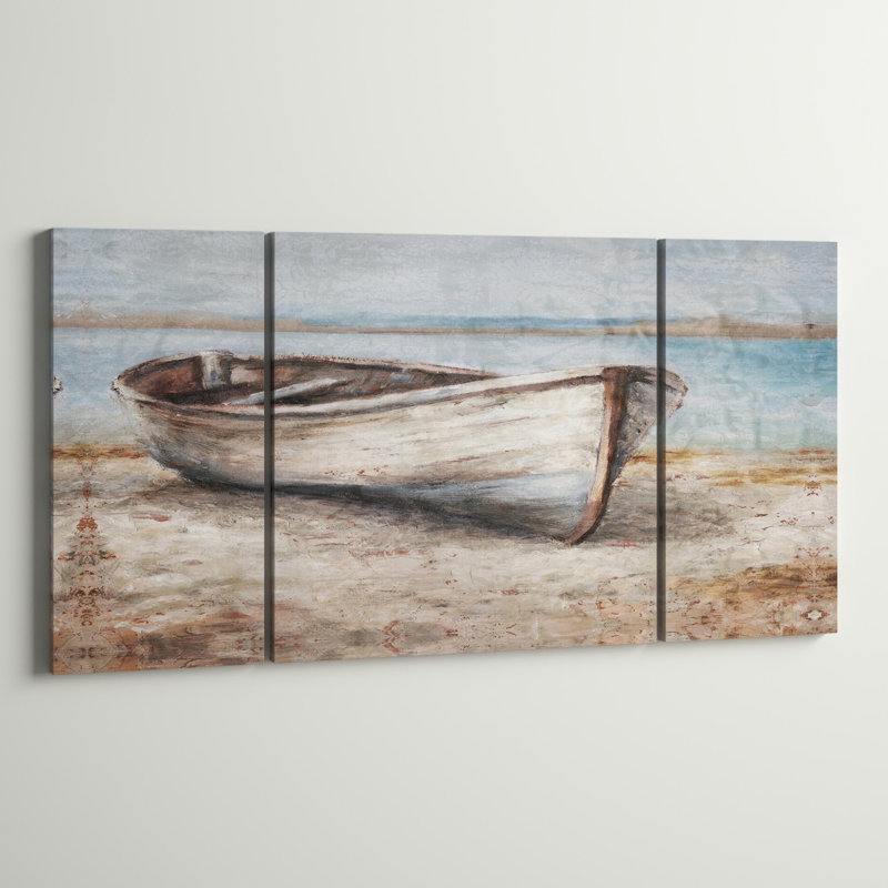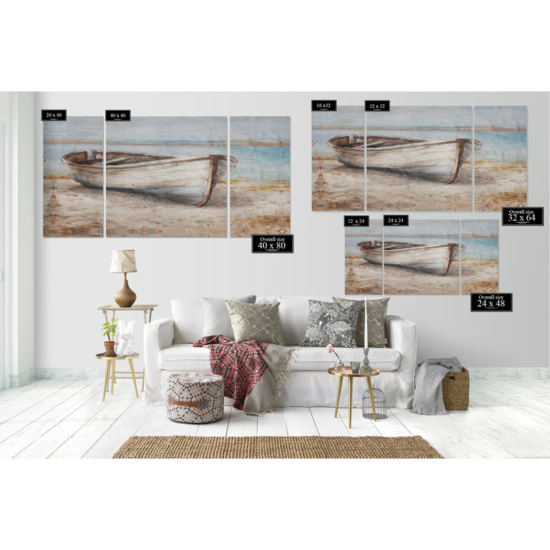 Bring rustic coastal design to your living room or bedroom with this triptych. It showcases three panels – the middle one is wider than the end two – with a row boat that’s sitting on the beach with t…. Read More.
