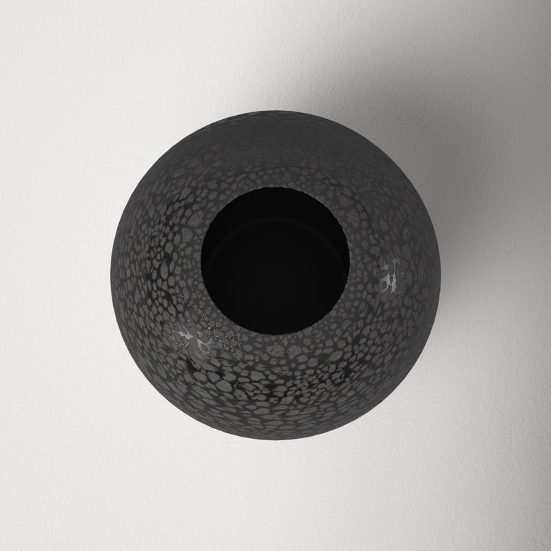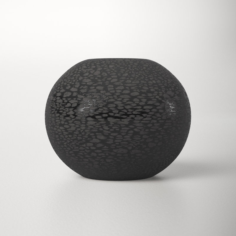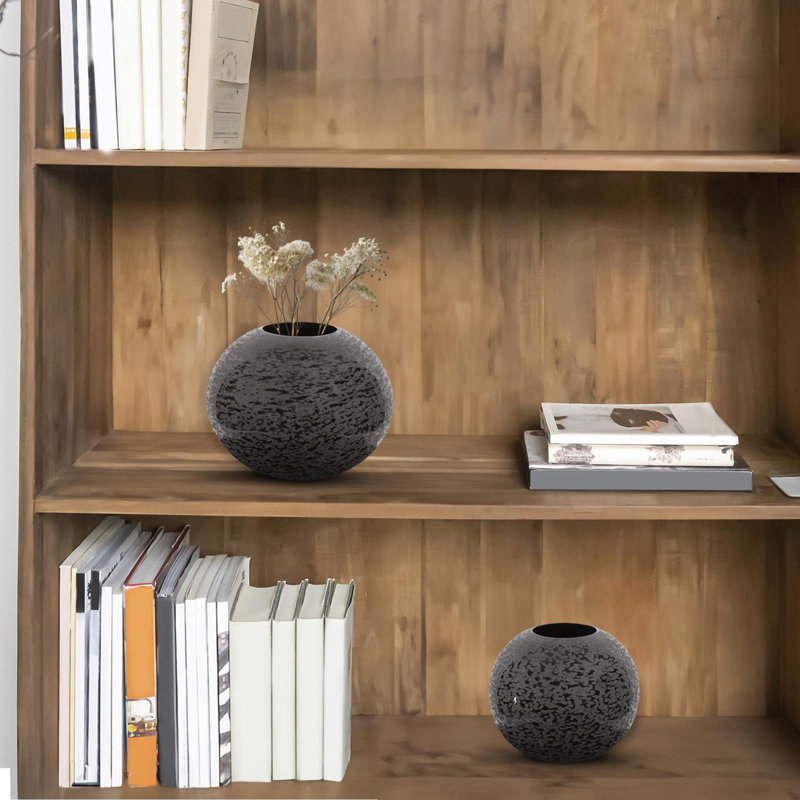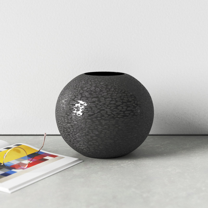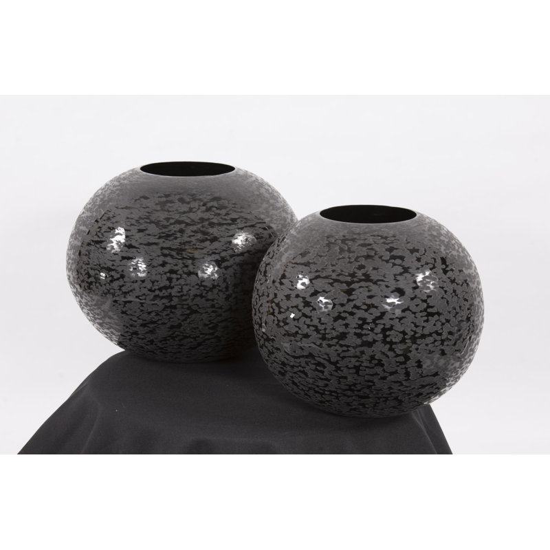 This interesting vase features a glossy black, globe shape formed from iron. What makes it unique, is the chiseled texture characterizing the exterior, creating an intriguing 2 toned effect. Pair with the coordinating pieces of the collection to complete the look.