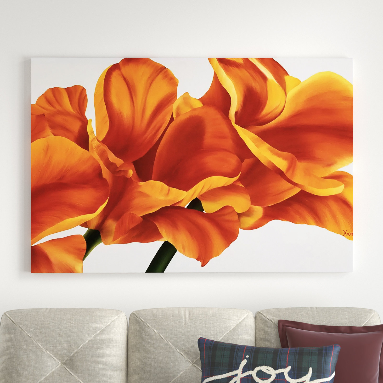 This graphic art print by artist Yvonne Poelstra-Holzhaus adds a vibrant touch of floral elegance to your home decor. The landscape-oriented print, titled “Fancy Flowers II,” features bold and captivating orange flowers against a crisp white background, creating a striking contrast that draws the eye. Printed on an artist-grade cotton-poly canvas, this piece is framed in wood for a polished look. With its rectangular shape, this wall art complements a variety of interior styles from boho to mid-century. Enjoy the charm of this floral print as it enhances your living room, bedroom, or hallway.