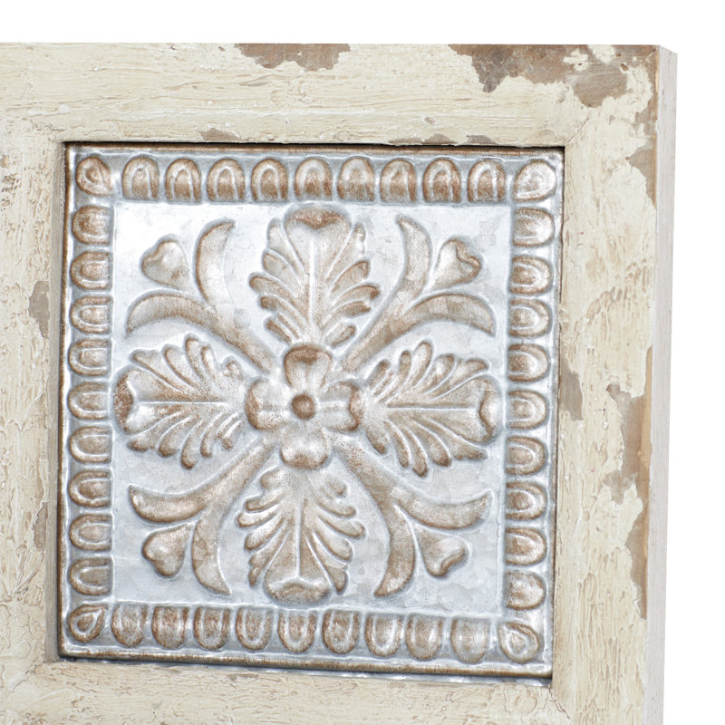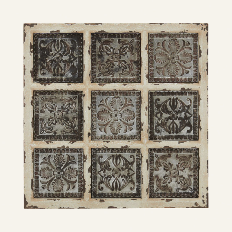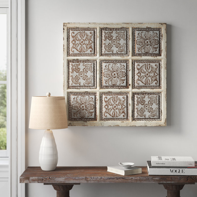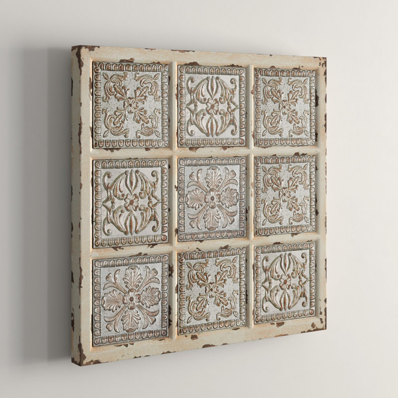 Bring a pop of the French countryside to your kitchen or living room walls with this 31” square wall plaque. It’s framed with wood in a rustic, reclaimed finish, and showcases a windowpane style design. Inside each pane sits a metal square with embossed, scrolling floral details, offering up a must-have vintage look. This piece of wall art arrives with mounting hardware, so you can hang it up in no time. Hand-curated by Kelly Clarkson.