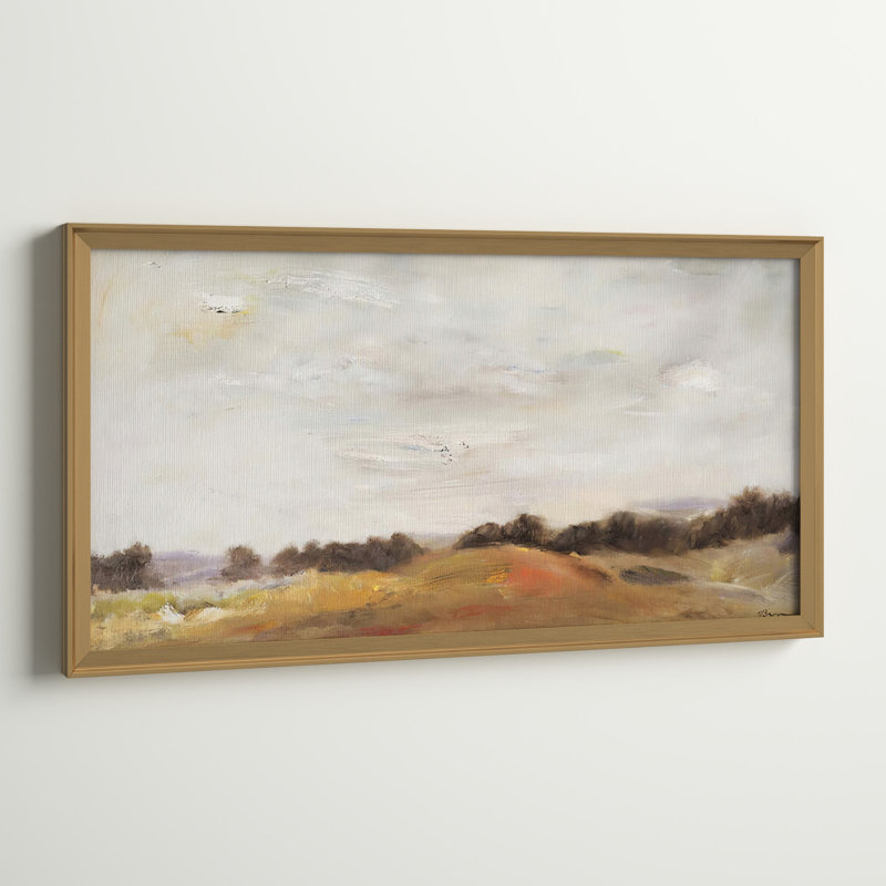 This painting print showcases a vibrant, traditional landscape that brings just the right amount of natural charm to your space. Printed in the USA on canvas and titled “Fields of Gold,” this piece features a rolling field beneath a spacious overcast sky. It comes in green, gray, and brown tones that blend to add a rich, painterly look to any room in your home. This print is held in place by a distressed wood picture frame, with a single hook in the back for hassle-free wall mounting.