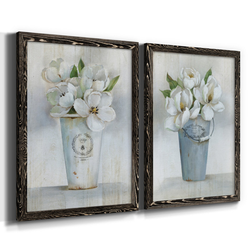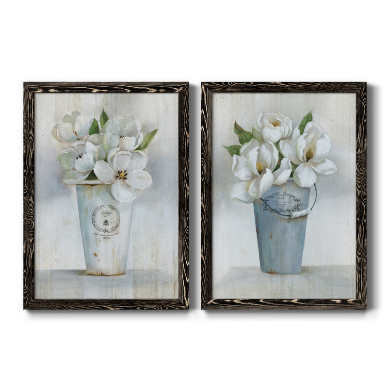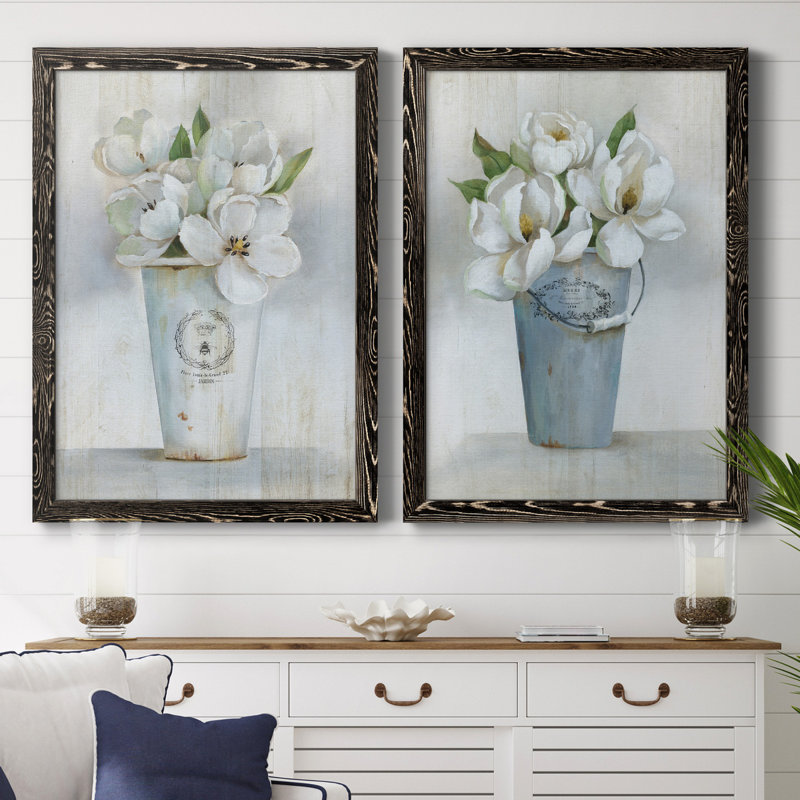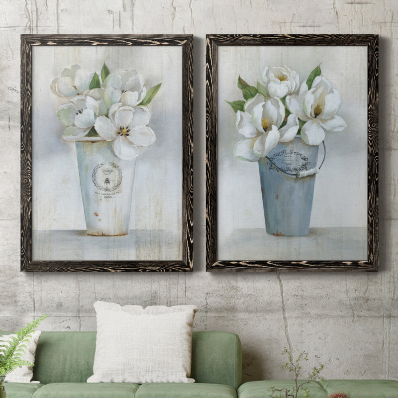 This 2-piece painting print spruces up your living space with its floral theme and cool-toned palette. Each vertical, rectangular piece depicts a charming bunch of white flowers, one arranged in a white bucket and the other in a light blue bucket. They feature subtle white and gray backgrounds, allowing the flowers’ detailed vases and bright green leaves to shine. This set is printed on paper or canvas in the size and frame style of your choice. Rustic and botanical, it complements decor styles from traditional to the modern farmhouse.