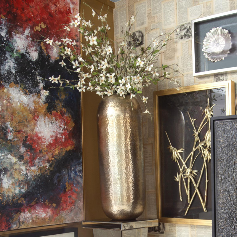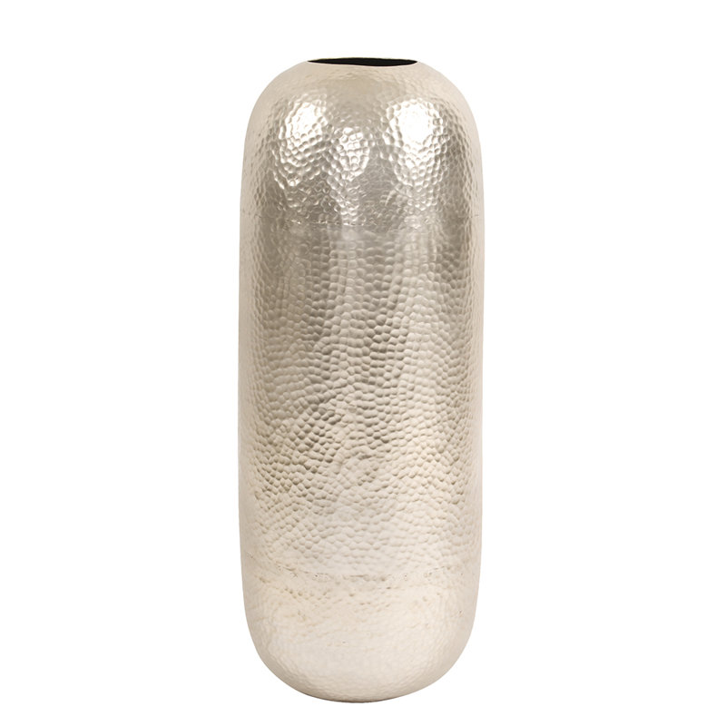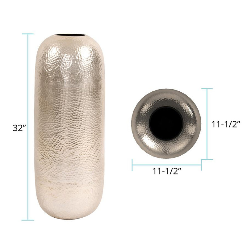 This metal vase is tall and oversized which makes it a perfect floor vase. The main body of the vase is cylindrical. The entire piece is then finished in a deep bronze or silver and characterized by a fine, hammered texture. Alone or in multiples this vase will look great in any room.