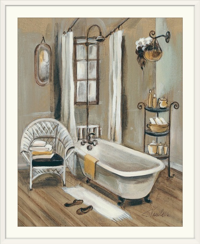 This painting print brings French-country charm to your space with its homey rendition of a rustic interior. Reproduced from an original work by Silvia Vassileva, it features a claw-foot bathtub, an a…. Read More.
