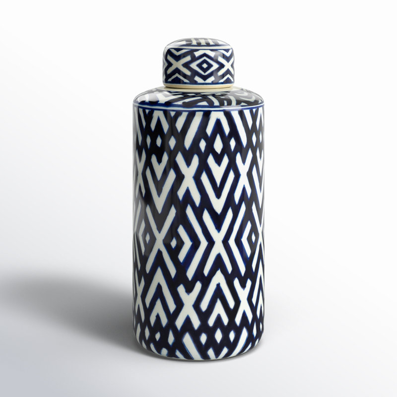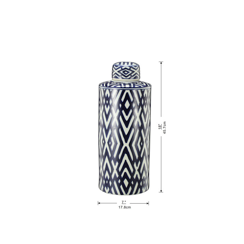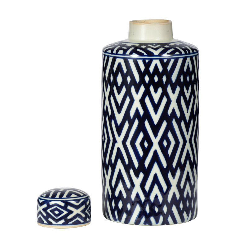 The gorgeous Carlyle Lidded Jar combines traditional patterns and contemporary craftsmanship for timeless appeal. This piece is crafted from durable Porcelain, glazed in a soft white and decorated with deep blue geometric patterns.