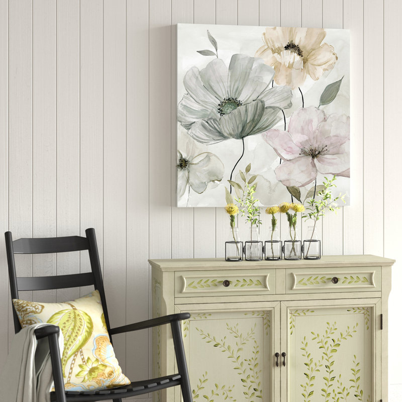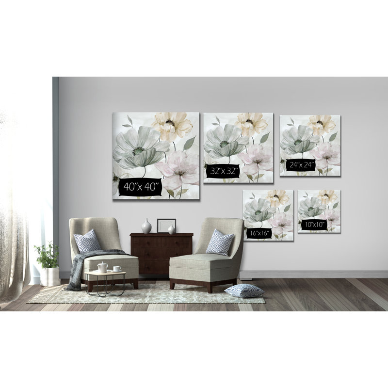 Bring botanical style to your space with this distinctive giclee print. Entitled “Garden Grays Detail II,” this square acrylic painting is printed on cotton canvas and hand stretched over a frame. It depicts an array of blossoms and leaves in shades of blue, green, pink, and tan against a gray and white background. This print is made in the USA. It includes mounting hardware, so it’s easy to hang over your sofa, bed, or dining room table.