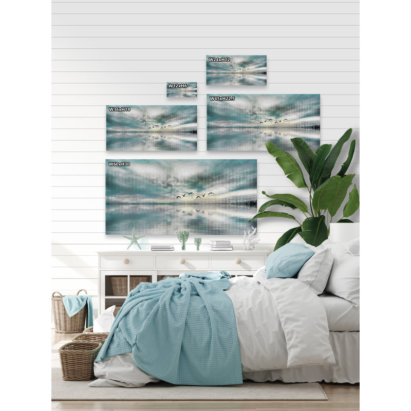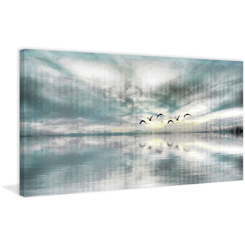 This print brings coastal energy to bare walls with a touch of texture and a breezy color palette. Hues of blue, white, and yellow depict the sun setting over the water while a flock of seagulls flies by. Made in the USA, this design is printed on wrapped canvas and showcases a subtle weave. UV-resistant inks mean this print isn’t afraid of being set on sunny walls. Best of all, it comes ready to hang right out of the box with wall-mounting hardware included.