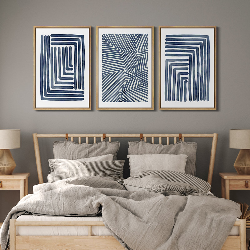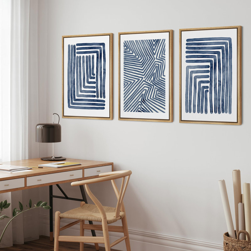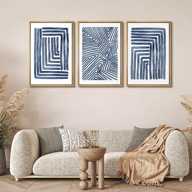Geometric Line Navy Blue Stripe Abstract Boho Mid-Century Modern Frame Canvas 3 Piece Print Wall Art