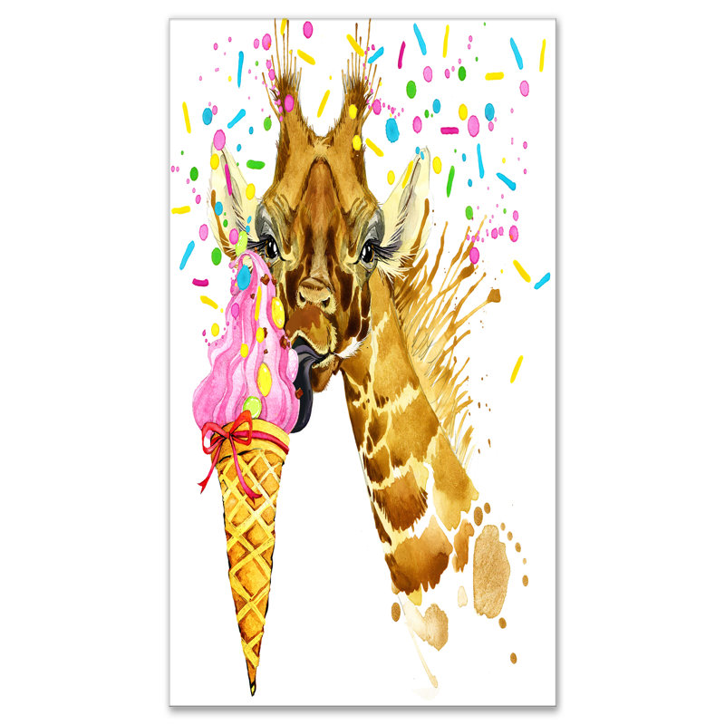 This ‘Giraffe Eating Ice Cream Watercolor’ – Wrapped Canvas Print is printed using the highest quality fade resistant ink on canvas. Every one of Truly Teen fine art giclee canvas prints is printed on premium quality cotton canvas, using the finest quality inks which will not fade over time. Each giclee print is stretched tightly over a wood sub frame ensuring the canvas is taught and does not buckle.