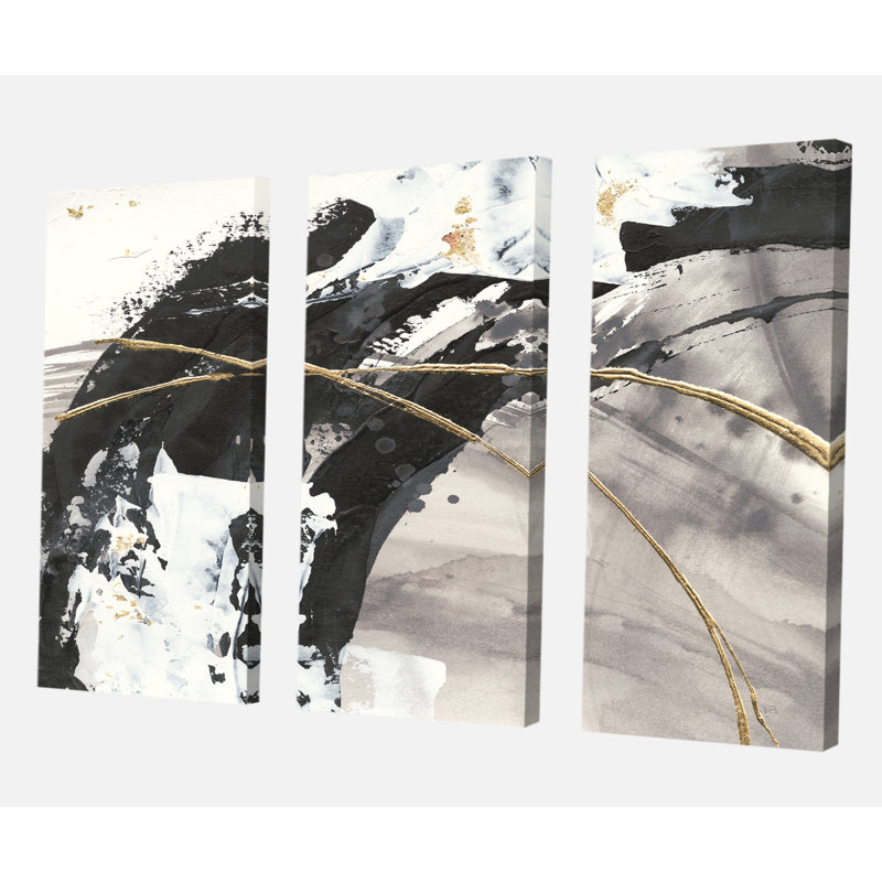 This triptych wall art set elevates your space with an eye-catching look and contemporary color palette. Originally a single original image, it’s a reproduction printed with premium inks across three vertical-oriented rectangular canvases. The abstract design features bold brush strokes and sweeping movements in black, white, gold, and gray hues. Arrange the pieces side-by-side or with some space between them – it’s up to you! We love that this wall art comes with mounting hardware, ready to hang right out of the box.