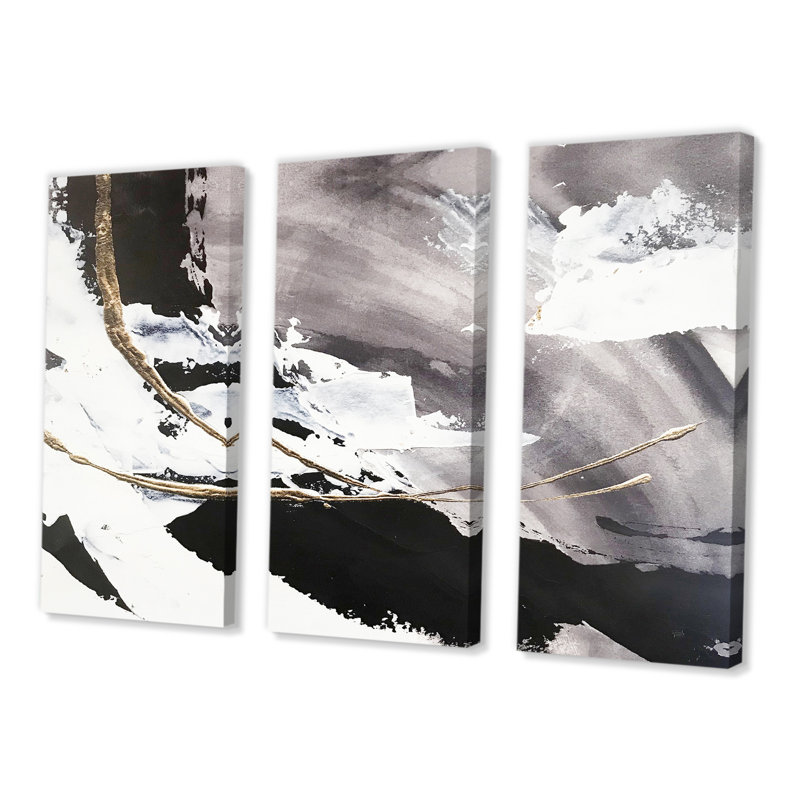 A traditional triptych design gets a modern glam makeover with this 3-piece giclee print set. Swirls and arcs of black, gray, and gold tones are scattered throughout each of the rectangular pieces for a striking abstract work that stands out wherever you put them. These paintings are printed on a wrapped cotton canvas using fade-resistant inks that are ideal for sun-soaked rooms. They also arrive ready to hang right out of the box thanks to the three included wall hooks.