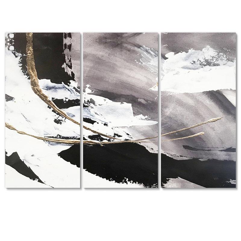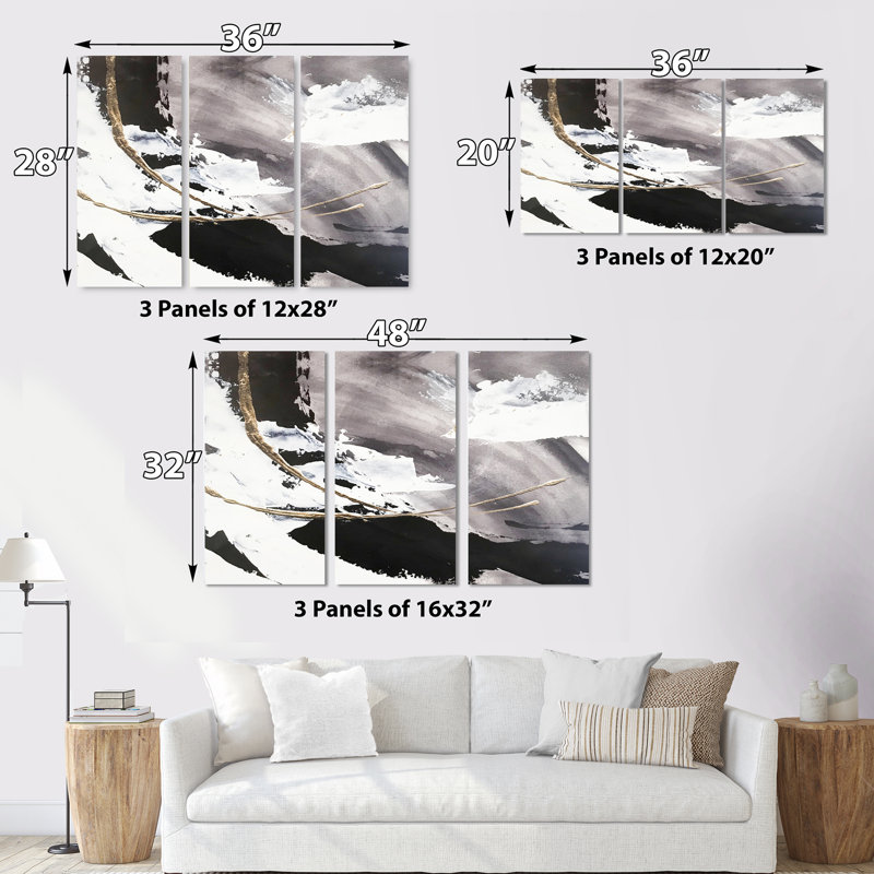 A traditional triptych design gets a modern glam makeover with this 3-piece giclee print set. Swirls and arcs of black, gray, and gold tones are scattered throughout each of the rectangular pieces for…. Read More.