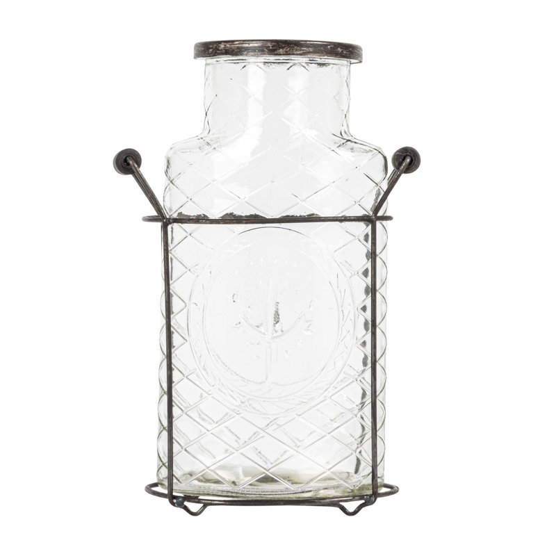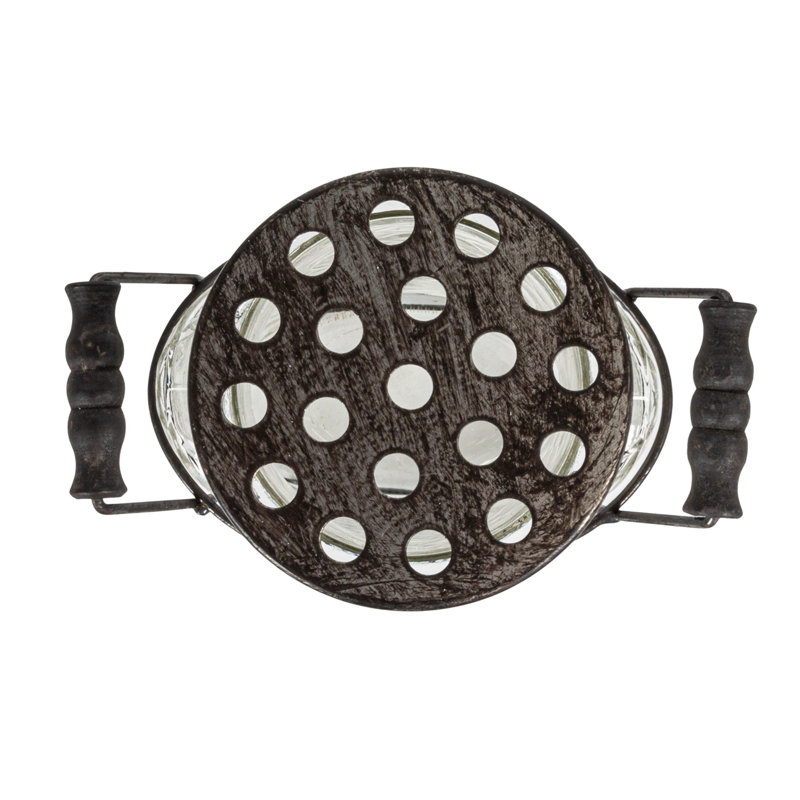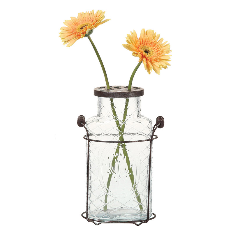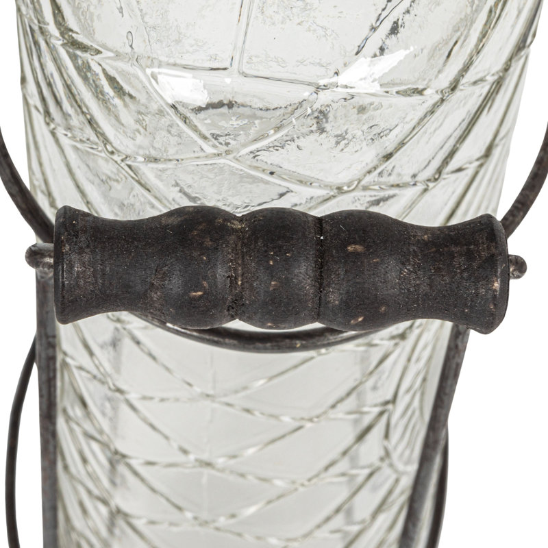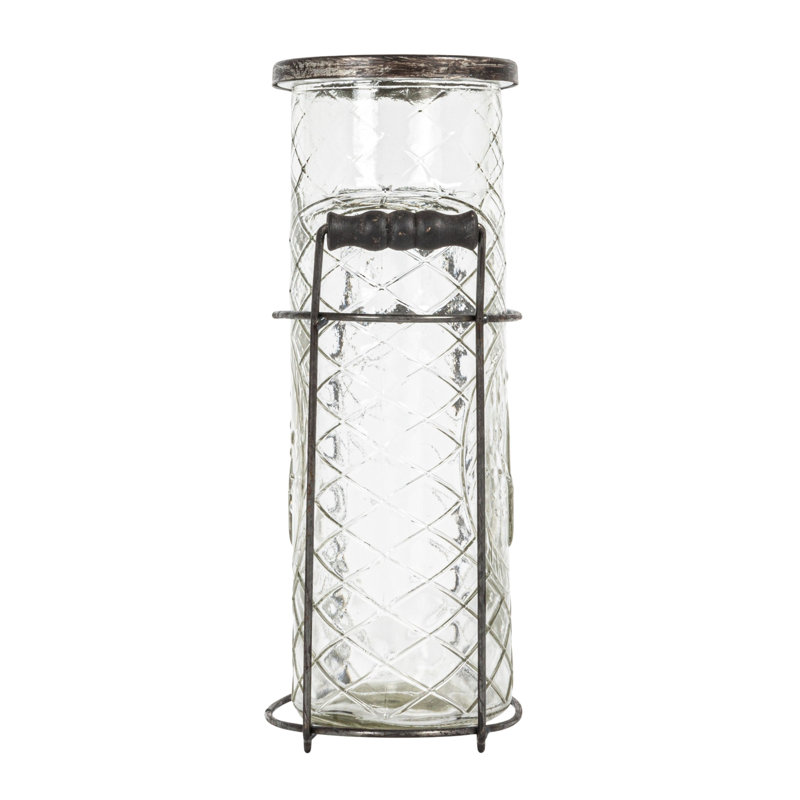 This clear glass vase with a frog lid and holder is a lovely way to display plants or flowers. This cylindrical vase has a clear glass body that showcases the beauty of plants or flowers. It also has a metal frog lid that helps arrange the stems in a neat and orderly way. The frog lid has holes that allow air circulation and water drainage, keeping the plants or flowers fresh and healthy. The vase also comes with a wooden holder that adds some height and stability to the display. The holder has a metal ring that secures the vase and prevents it from tipping over. The holder also adds some contrast and texture to the sleek glass vase. This vase is suitable for a contemporary, minimalist, or industrial style of home decor. It will add some sophistication and simplicity to the space. This vase measures 5.5 inches in length, 3 inches in width, and 7.25 inches in height. This clear glass vase with a frog lid and holder is a wonderful way to showcase plants or flowers.