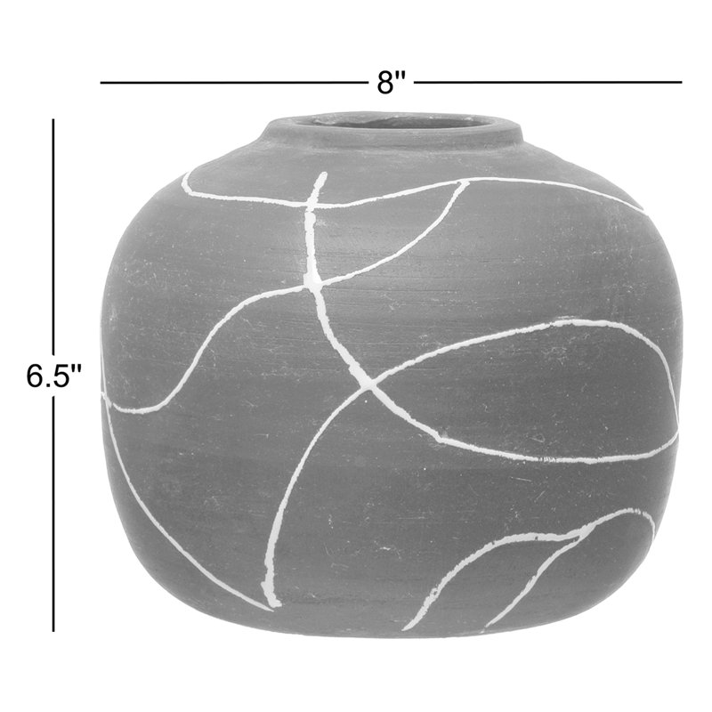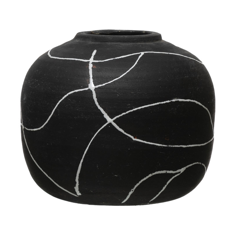 Add some elegance to the home with this black and white stoneware vase. This beautiful vase is made from stoneware. The vase has a hand-painted black and white intersecting line pattern that creates a striking visual effect. The vase has a round shape and a smooth surface that reflects light and adds dimension. The vase measures 8 inches in diameter, and 6.5 inches tall, perfect for accenting nightstands, dressers, and coffee tables. Whether filled with fresh flowers, dried branches, or artificial plants, this vase will surely enhance any space. This vase is also a great gift idea for anyone who loves art and design.