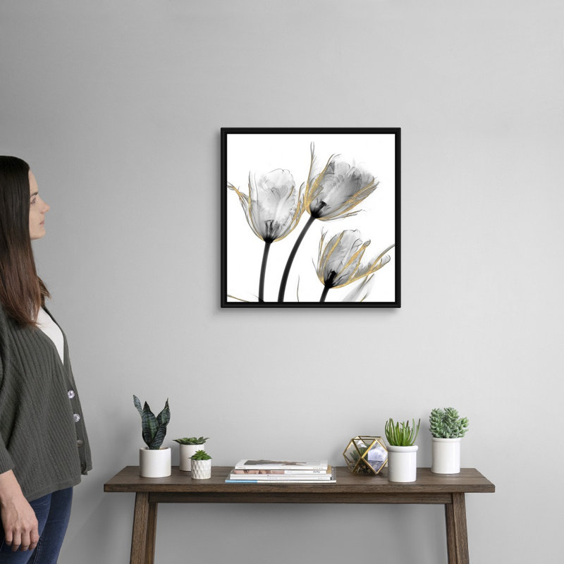 This floral painting print features a trio of blooming tulips for a fresh and minimal look on your walls.The flowers showcase muted tones of cream and gold in a watercolor style with black accents and botanical leaves against a crisp white background. It’s placed on an artist-quality canvas in your choice of framing option, and it features an array of different sizes that accommodate entryways or living rooms big and small. Plus, we love that this painting print comes with hanging hardware, so you can display it as soon as it arrives.