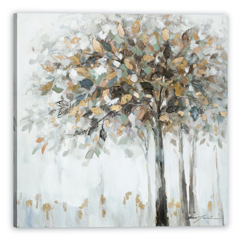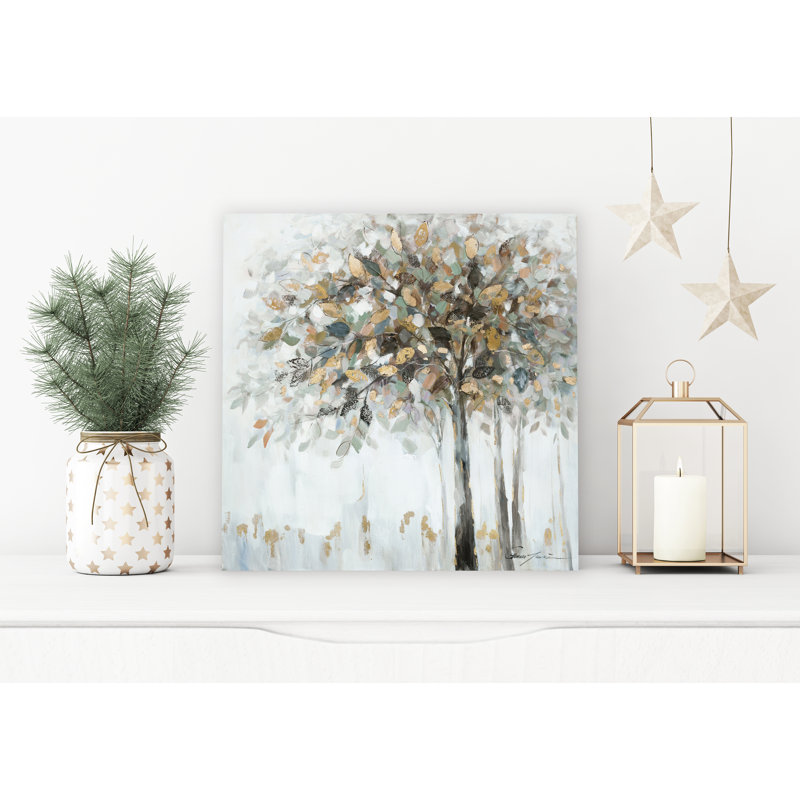 This oil painting print brings a natural, floral feel to your bare walls. Entitled, “Gleaming Gold Tree,” this picture is the right addition to your French country decor with its layers of rustic leaves against a weathered white background with subtle tones of gray and green. It’s printed on canvas, and it’s gallery-wrapped around a wooden frame in a variety of sizes to choose from that best suits your space. This print also includes a single pre-installed wall hook on the bar for hassle-free mounting as soon as it arrives.