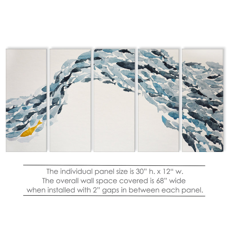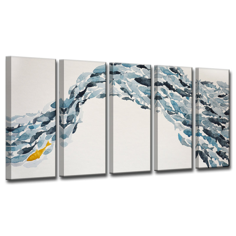 Bring coastal style to any space with this 5-piece print set. Entitled “Goldfish” by artist Normal Wyatt Jr., this distinctive set is digitally printed on canvas and stretched over kiln-dried pine wood frames. This set features five sections of an oil painting of a school of fish, rendered in shades of blue, gray, gold, and yellow on a white background. The pieces in this set can be hung separately or together for the full effect, and the included wall mounting hardware makes them easy to hang over your sofa, bed, or dining room table.