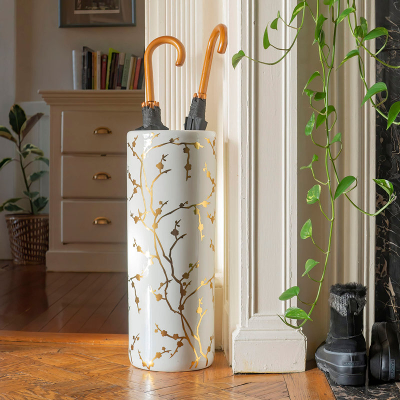 Cylindrical umbrellas stand in a modern abstract design. Made of strong vitreous porcelain. Great waterproof storage for umbrellas, canes, and walking sticks. Alternatively, use it as a floor vase for…. Read More.