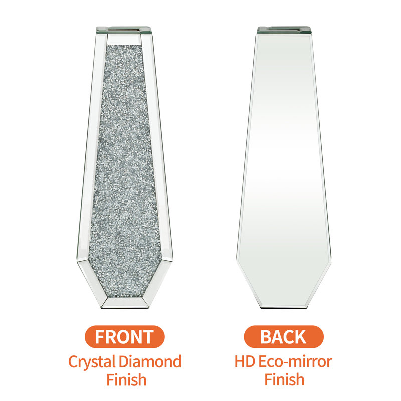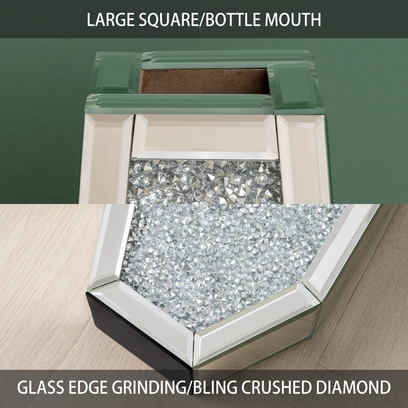 Add a touch of glam to your space with this mirrored glass floor vase€”where modern style meets timeless sophistication. Made from durable MDF engineered wood, it features a high-shine mirrored finish that reflects light to make any room feel brighter and more spacious. The front is embellished with sparkling crushed diamond inlays for a bold, eye-catching look. Available in silver, gold, or black, this vase effortlessly complements a range of decor styles. Beveled mirror edges and a fully mirrored back make it perfect for display from any angle.