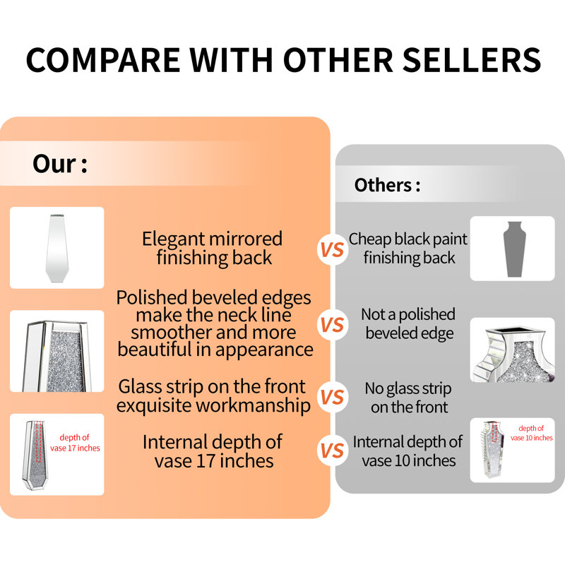 - SOPHISTICATED AND LUXURIOUS DESIGN €’ This tall mirror floor vase is inlaid with crystal crushed diamond on the front and covered by a high-definition eco-friendly mirror on the back. Shiny mirror tall vase, gorgeous appearance can blend with anywhere, which will add more vigor and sophistication to your room.