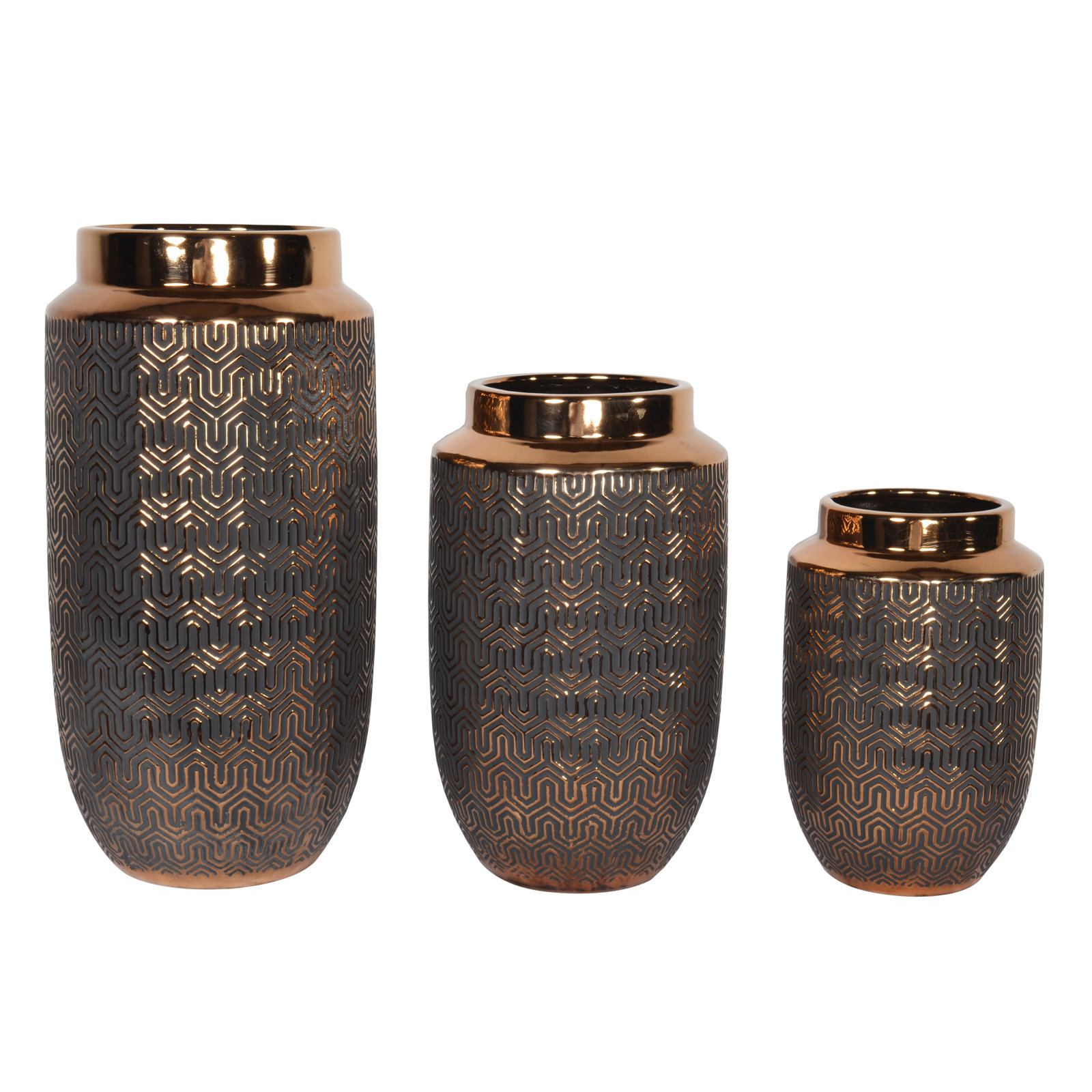 Add a dramatic focal point to your home decor with this set of 3 copper illusion vases. They are hand cast in Porcelain. The finish is striking with a unique twist of Copper and combined to create depth and a visual geometrical pattern. These are artful pieces and can be used for outstanding centerpieces or perfect multiple vases for holding flowers.