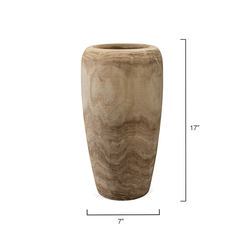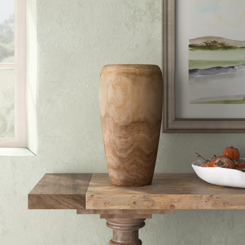 This wooden table vase adds a cool coastal farmhouse accent on your coffee table or console table. It’s handmade from wood and showcases natural waving wood grain in a brown tone for a rustic look. We love how its sanded tapered silhouette and rounded top edge creates a soft feel. This vase is not meant to hold water, making it ideal for dried flowers, or simply as a stand alone on your shelves. It measures 17″ tall, so it’s sure to make a statement wherever you add it.