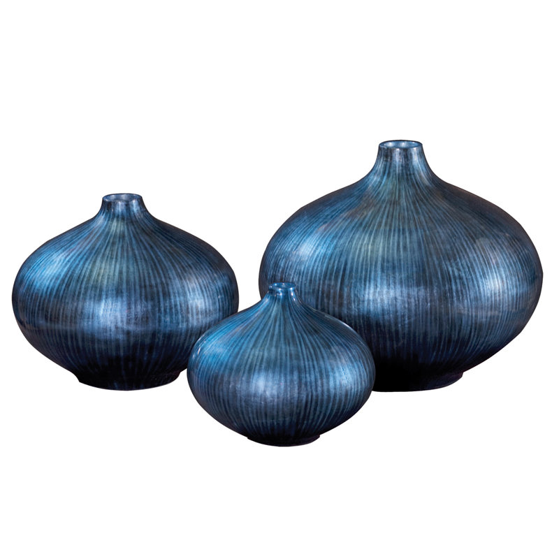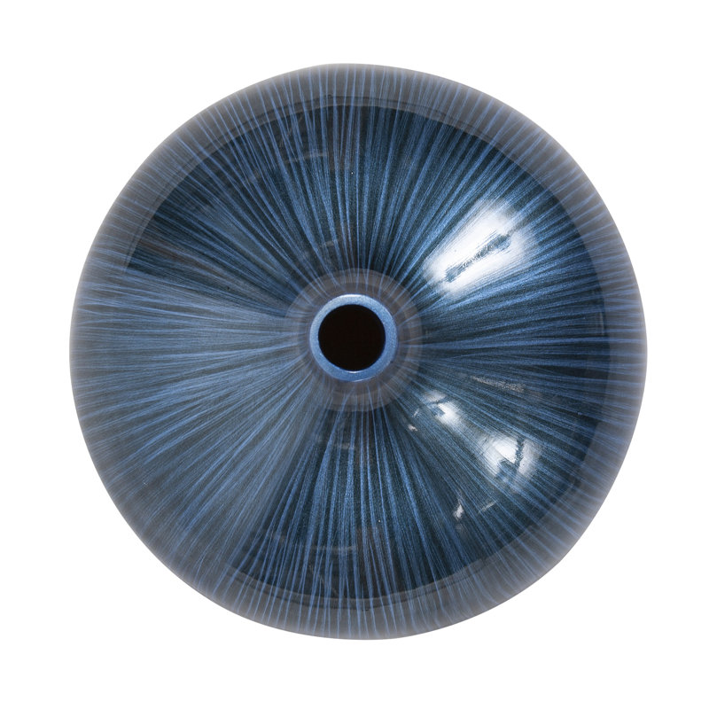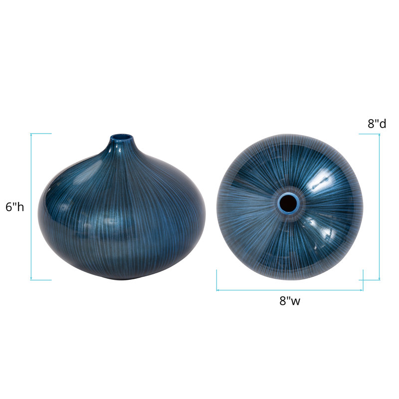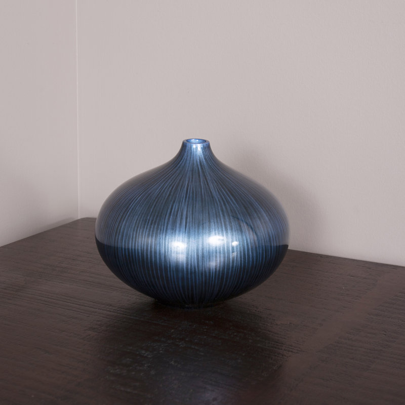 This gorgeous vase features a wood flattened globe shaped body. It is then finished in a deep arctic blue lacquer accented with black brush strokes. The vase has padded feet to protect your surfaces. Console tables, book shelves, pedestals or any other place that a punch of color is needed, are the perfect places for this vase.