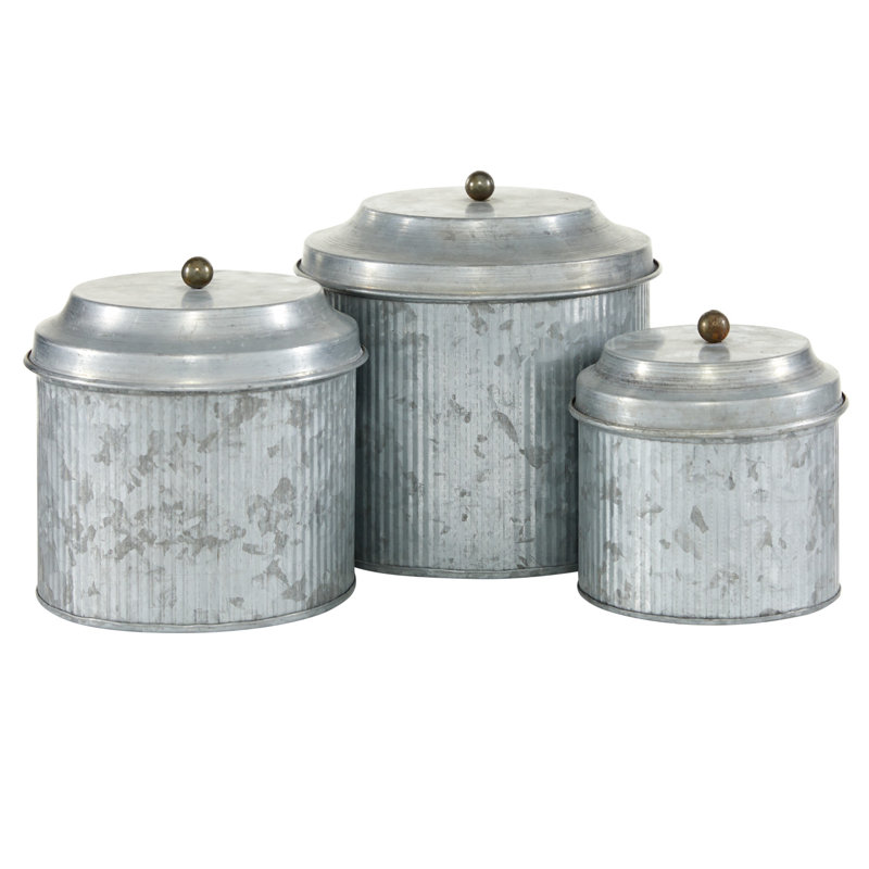 - Designed with a farmhouse style for that homey feeling. Crafted of solid iron for durability. Decoratively distressed and silver galvanized metal with vertical ribbing. Decoratively distressed and dimensional galvanized metal with vertical ribbing; round stacked lids with small, round, distressed bronze handles Set of 3 large canisters 7″ L x 7″ W x 8″H, 6″L x 6″ W x 7″H, 5″L x 5″ W x 6″H and collectively weigh 3.09 lbs