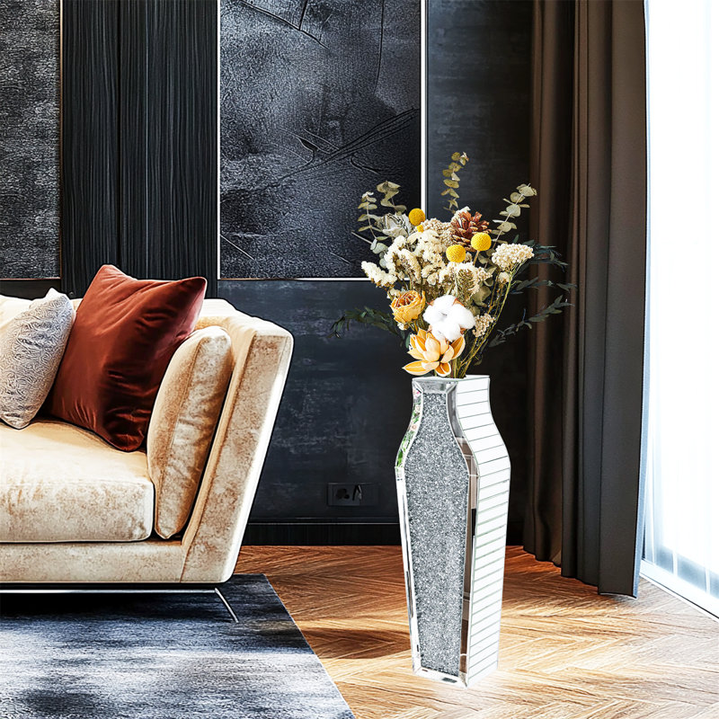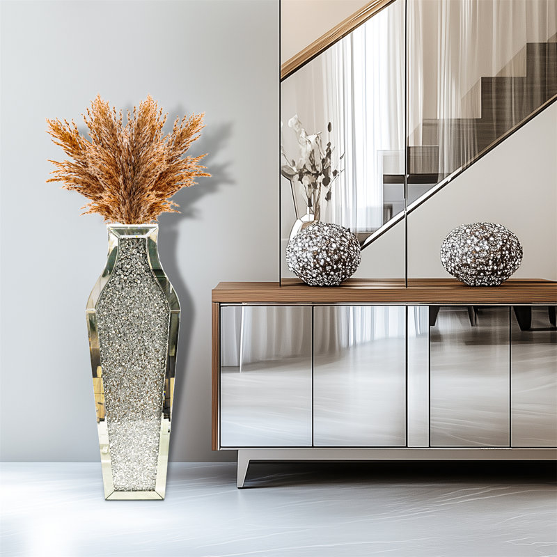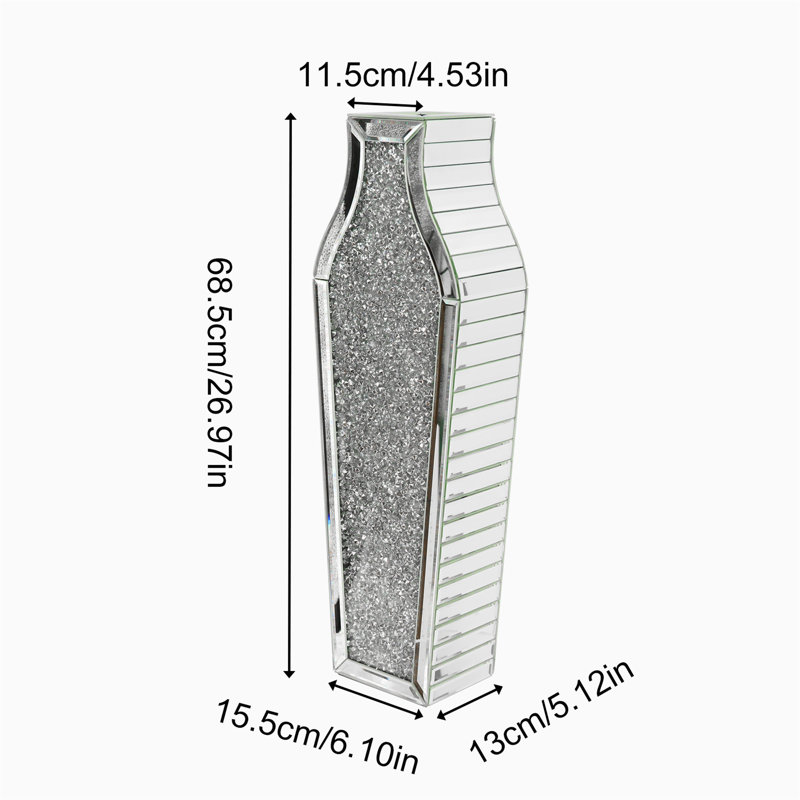 Exquisite Artistic Design.Crystal floor vase features a stunning front adorned with a full panel of silver diamonds embedded within the glass, the edges are beautifully framed with silver mirrors, creating a layered and artistic effect, the vase’s back is also a silver mirror, adding to its aesthetic appeal, its unique vase shape embodies an artistic beauty that will elevate any space