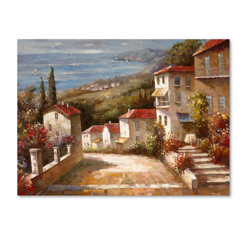 This oil-painting print showcases a scenic Italian village for a warm and sophisticated look that’s just right in your dining room or living room. This recreation of the artwork titled, “Home in Tuscany,” by artist Joval is printed on a polyester and cotton canvas in rich hues of red, green, and yellow. This rectangular design with a horizontal orientation features a Tuscan seaside village complete with green rolling hills and red-roofed stucco houses for the right Italian vibe in your space. Plus, this print comes with a stretcher bar and wall-hanging hardware.